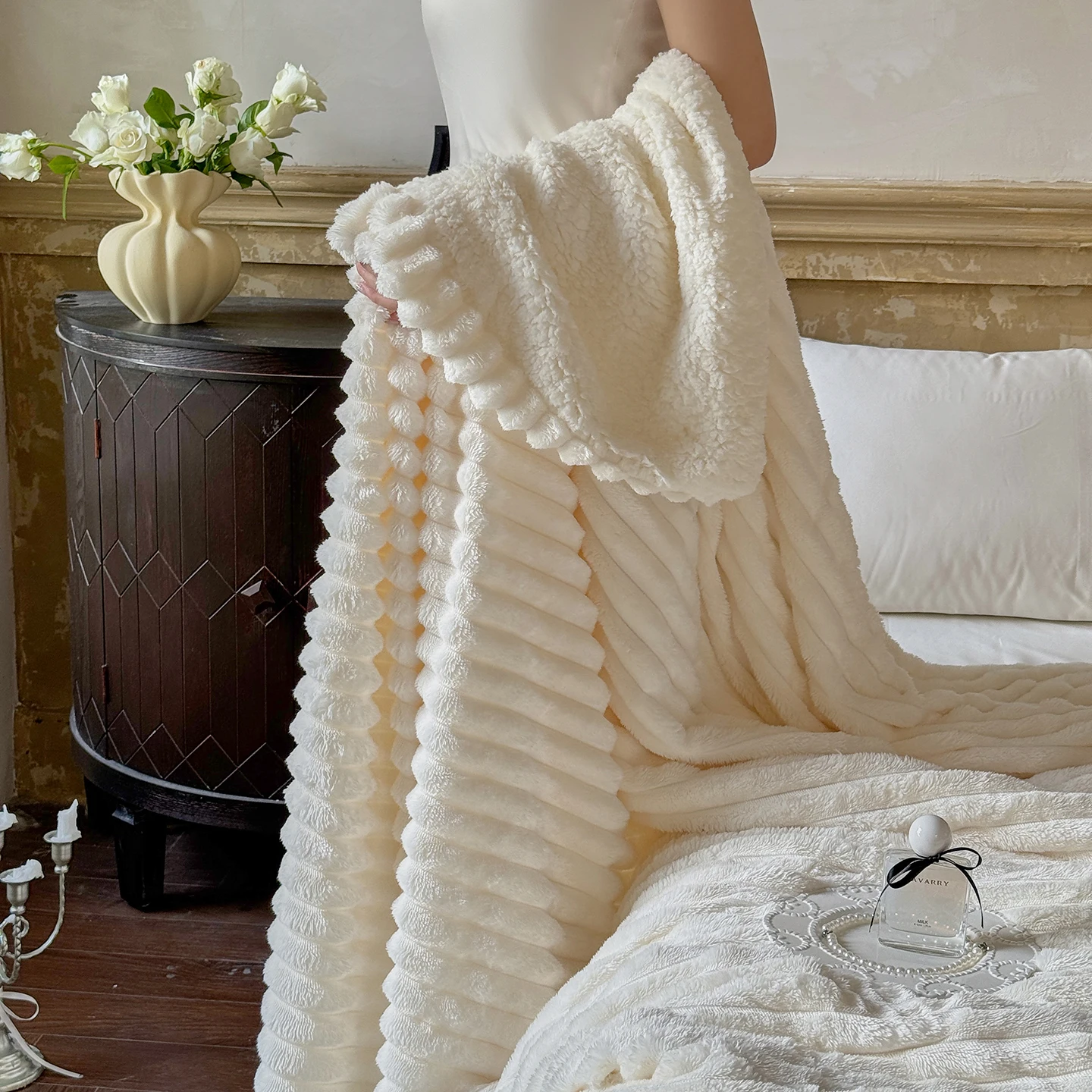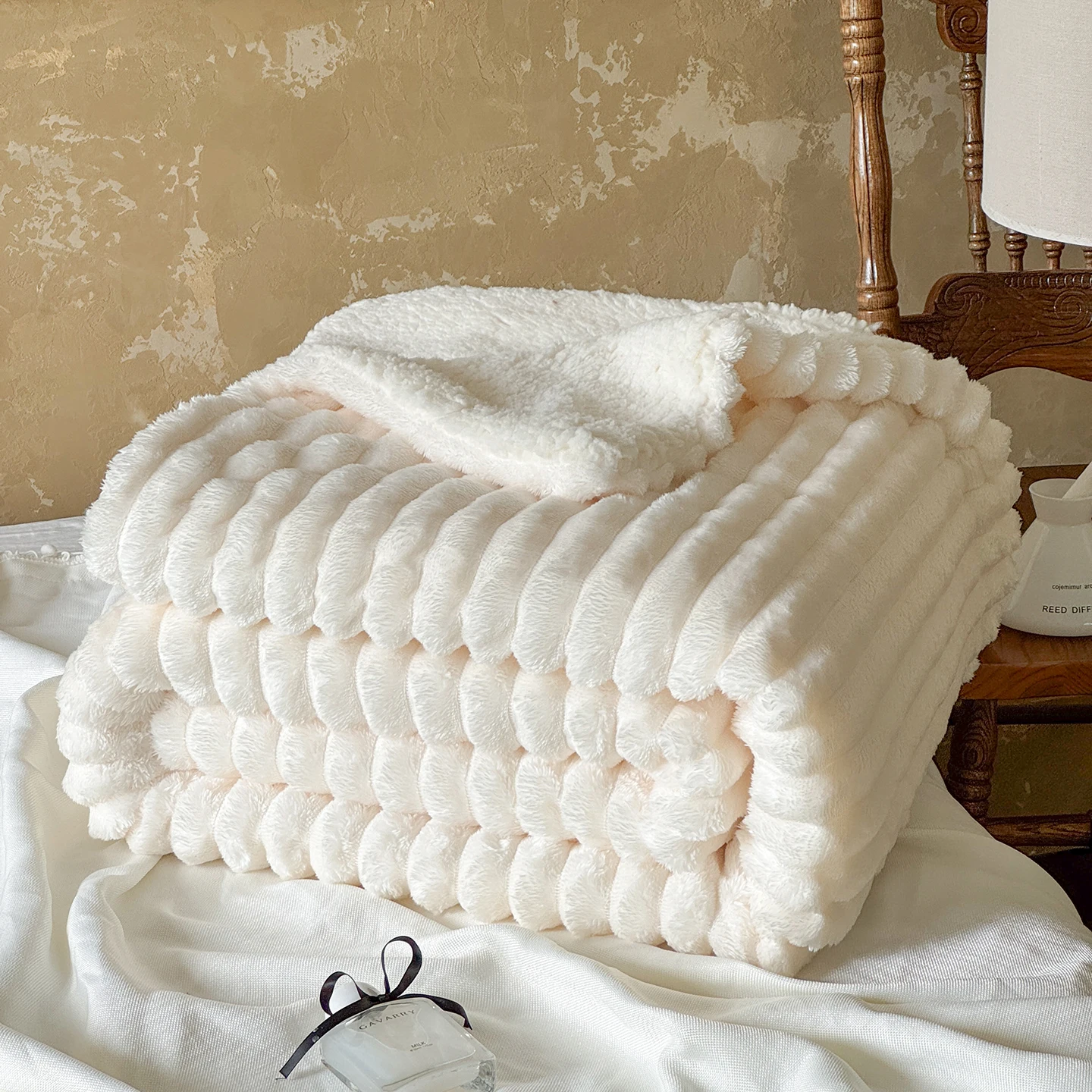 Hot Selling Warm Soft Luxury Polyester Double Layer Stripe Sherpa Fuzzy Plush Fluffy Throw Blanket for Winter