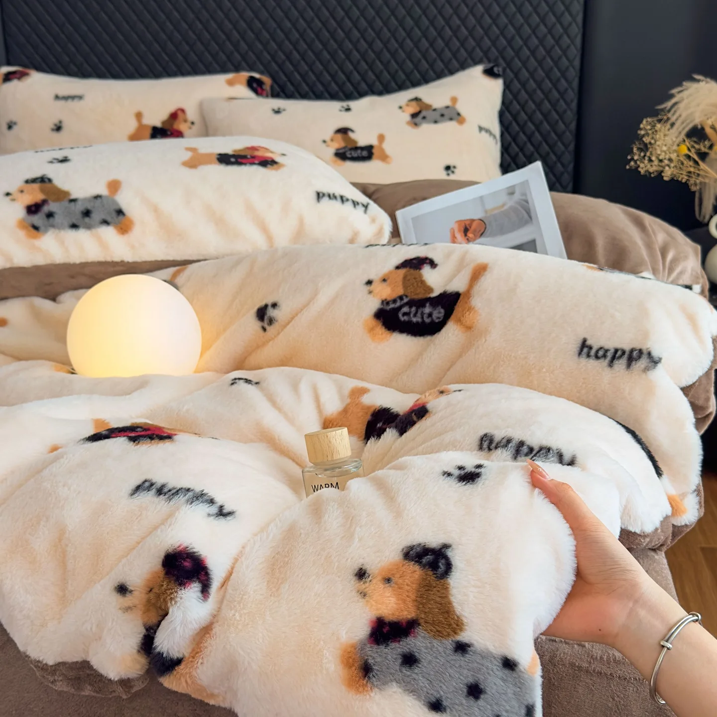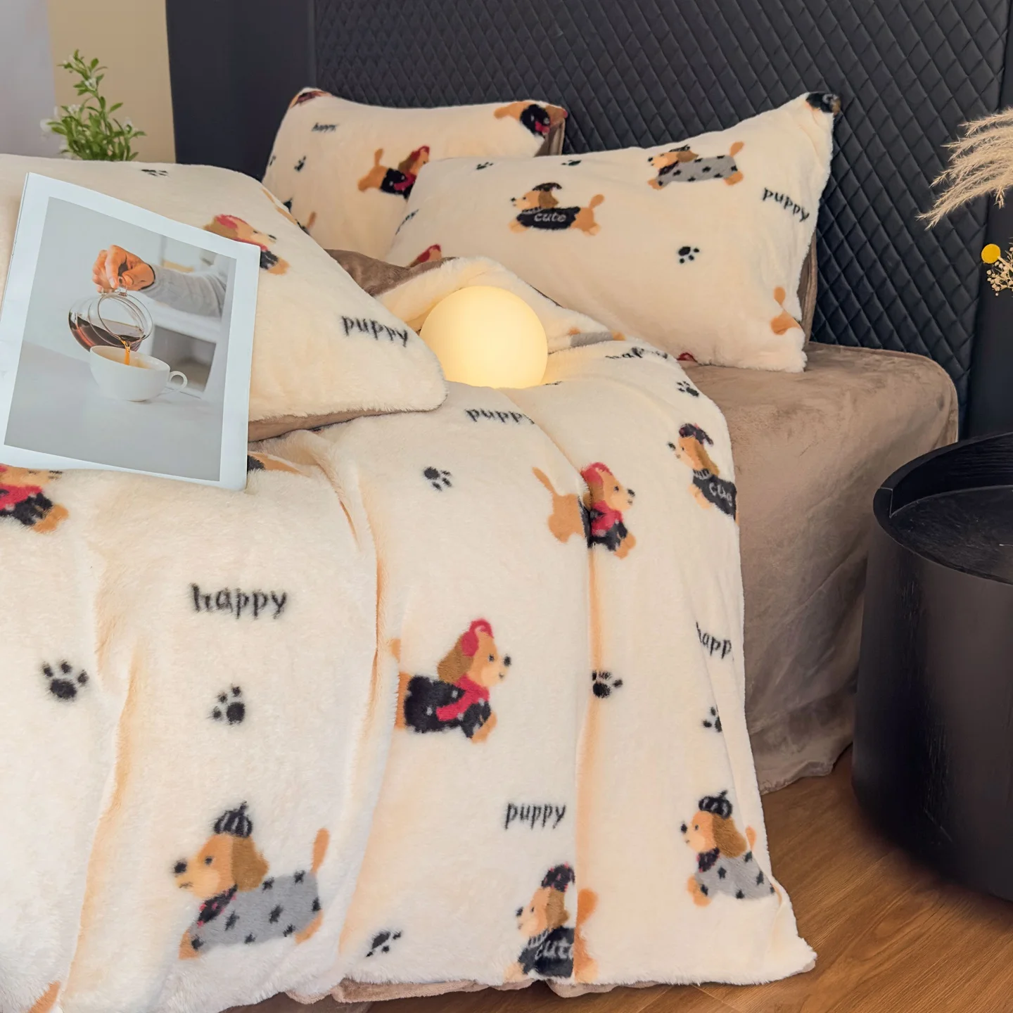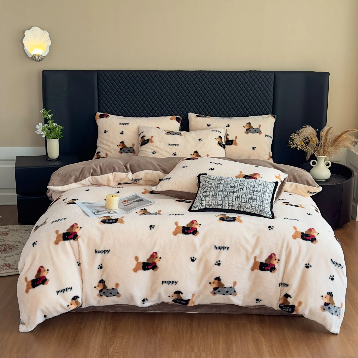 2026 New Cute Puppy Cartoon Floral Printed Milk Velvet 4pc Bedding Set Winter Thickened Warm Coral Velvet Duvet Cover Bed Sheet