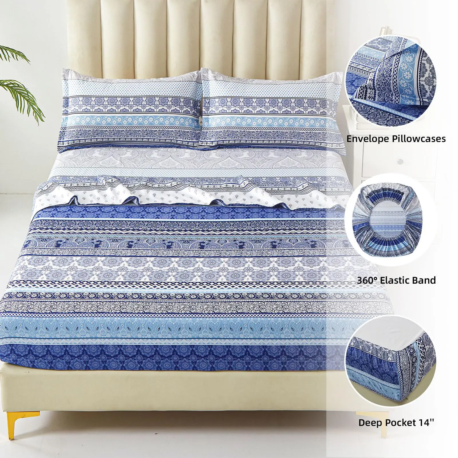 Luxury Bohemian Style 4pcs Microfiber Bedding Sets Printed Flat Fitted Sheet and Pillowcase King Queen Sizes Wholesale
