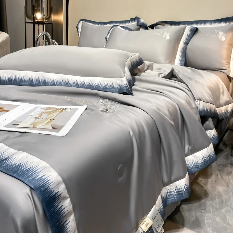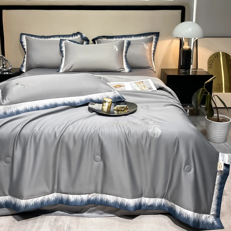 Luxury Embroidered Feather Silk-liked Quilt Sets Solid Color Cooling Beddings for King Queen Size 4Pcs Summer Sheets for Home
