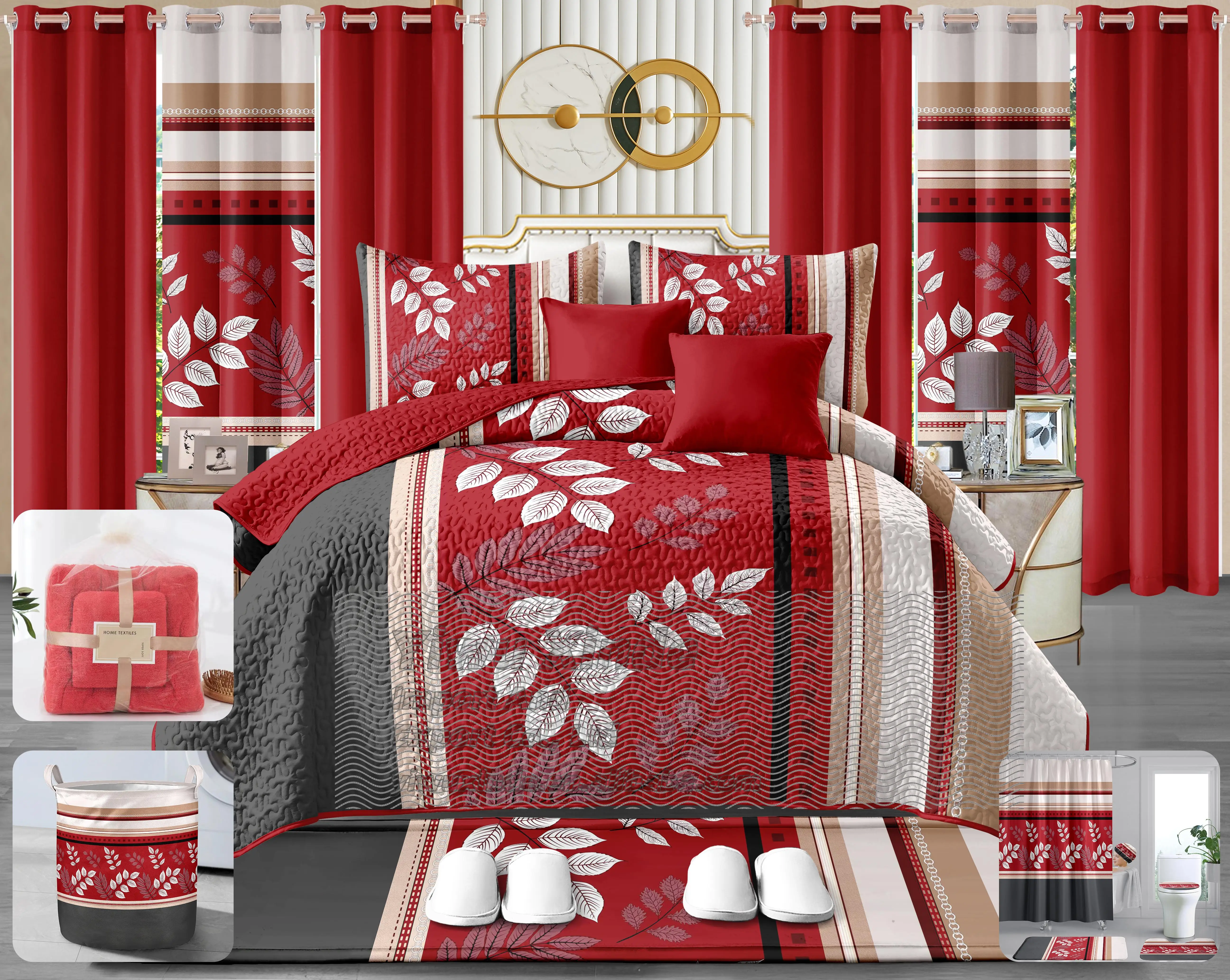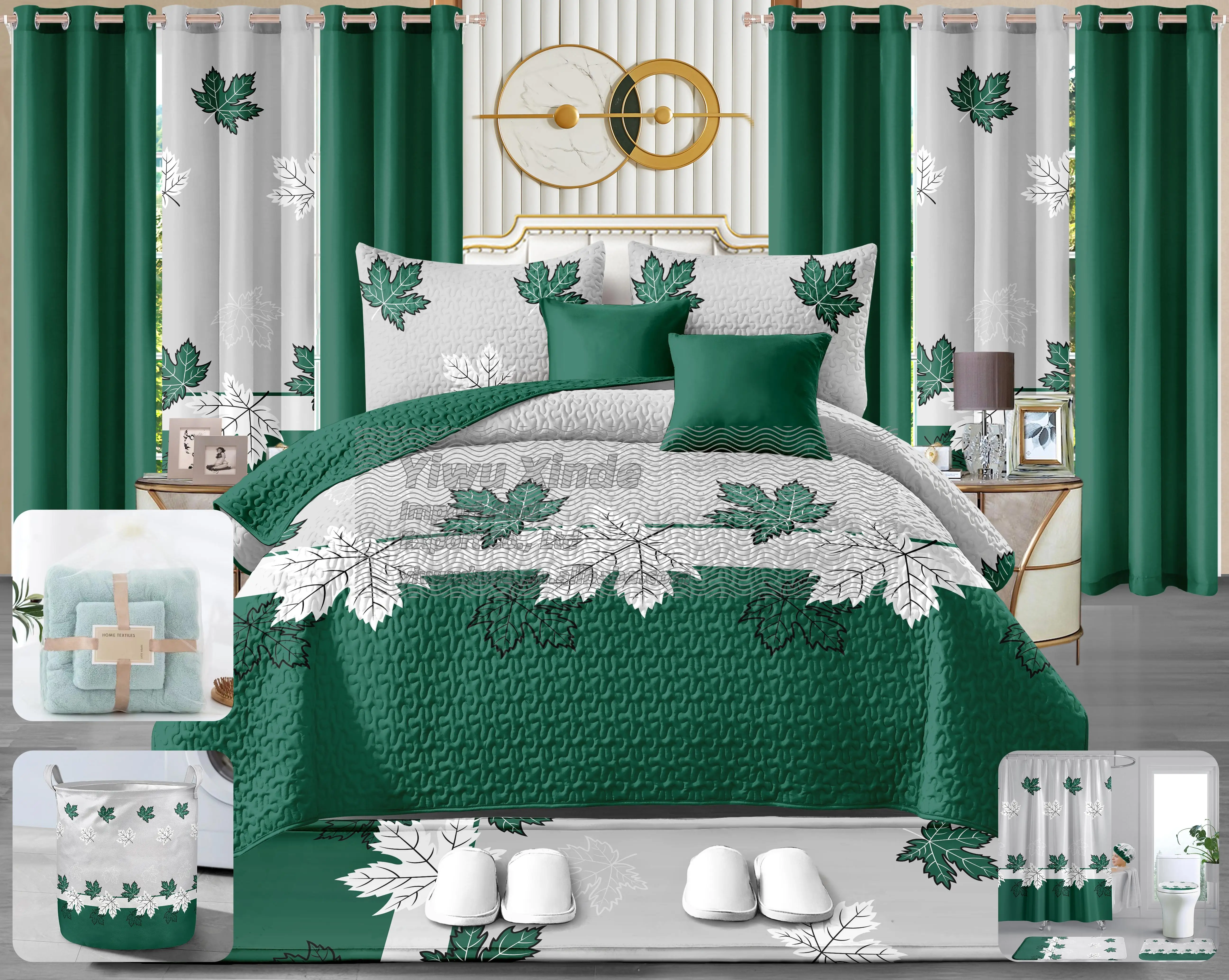 New Stock 24 Pieces Bedding Set king Size Christmas Red Green Home Decoration Bed Sheet Bedding Set 24 Pieces with Curtains