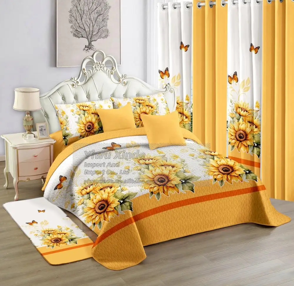 2026 New Model King Size Bedding Sets 12 Piece Cotton Filled Bedspread Flat Sheet Matched Curtains Plant Pattern for Hotel Home