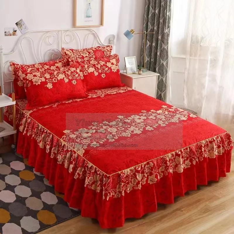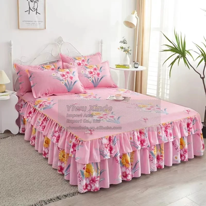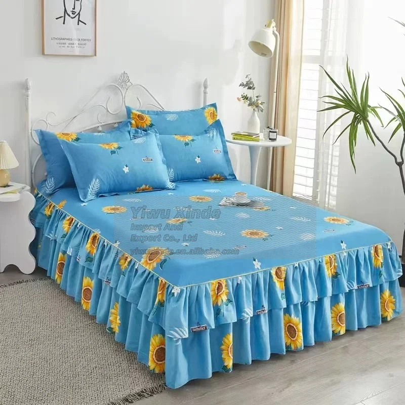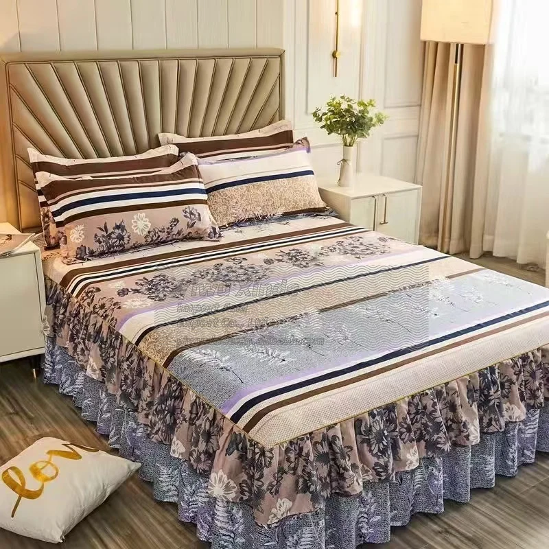 Newest Style 100% Polyester Bedding Luxury Bed Cover Modern Floral Plant Printed Thick Fitted Skirt Sheets 3Pcs Bed Skirt