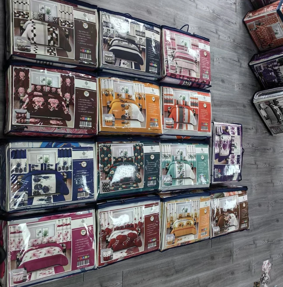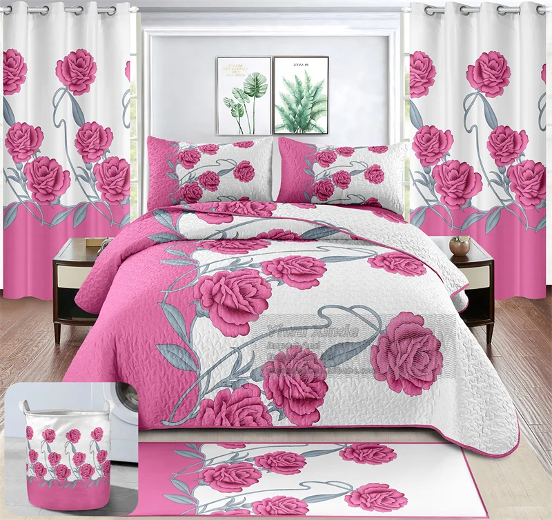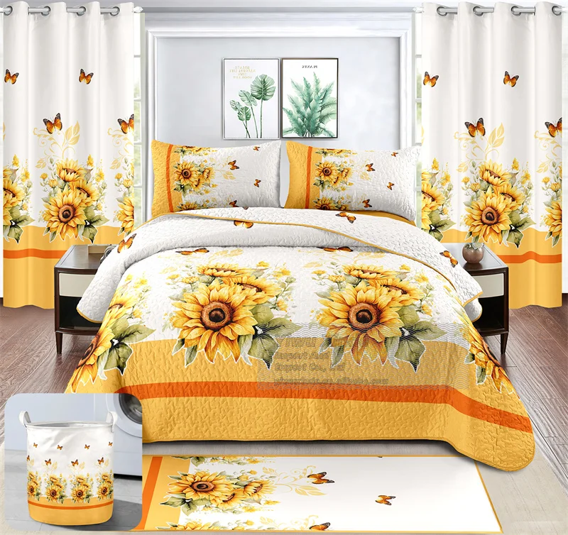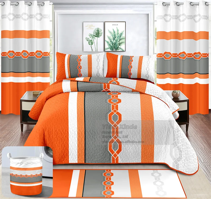 Ready Ship Modern 8pcs Bedspread Set Printed Plant Pattern Woven Technique Filling King Size Bedroom Bedding With Curtains 8pcs