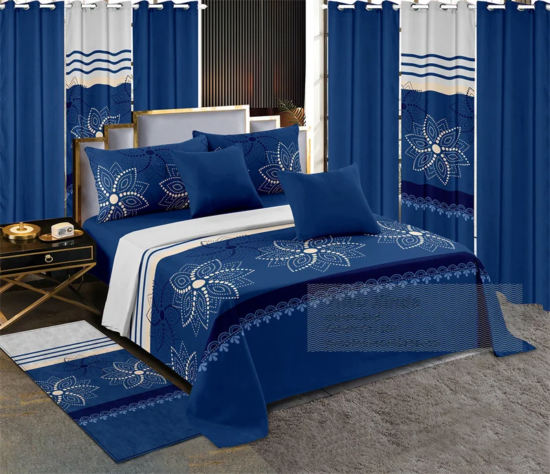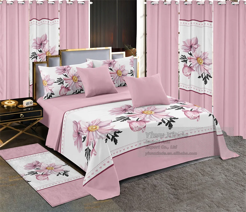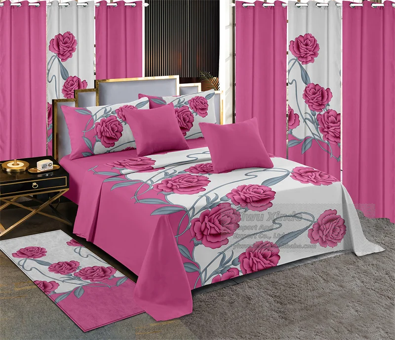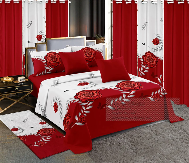 Red White Printed Microfiber Fabric king Size 13pcs Bed Sheet Set Luxury Bedding Set with Matching Curtains Carpet