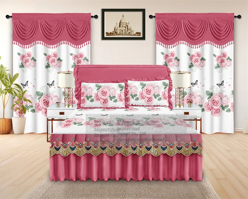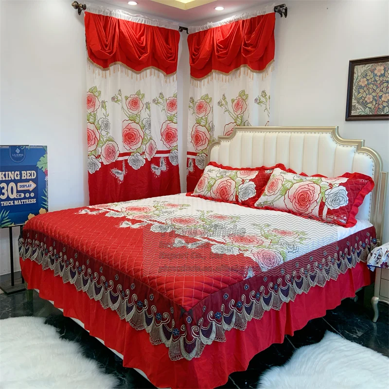 Hot Selling Luxury 5 Piece Bedding Set with Quilted Bed Skirt Lace Curtain Lace Pillowcases Home Textile Wholesale