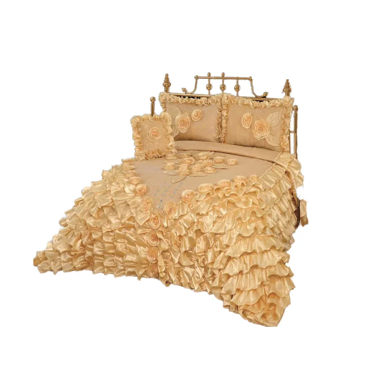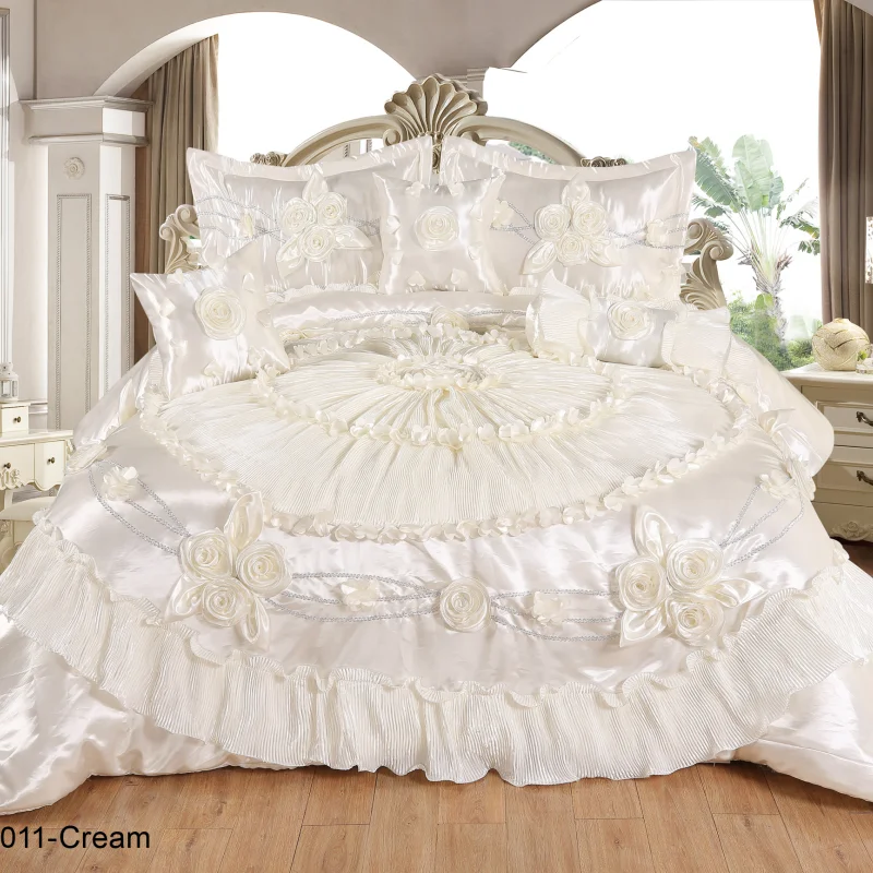 Hot Selling King Size Ruffled Duvet Cover & Bed Skirt 3D Rose Embroidery 6Pc Luxury Set Silver Patchwork Duvet Set