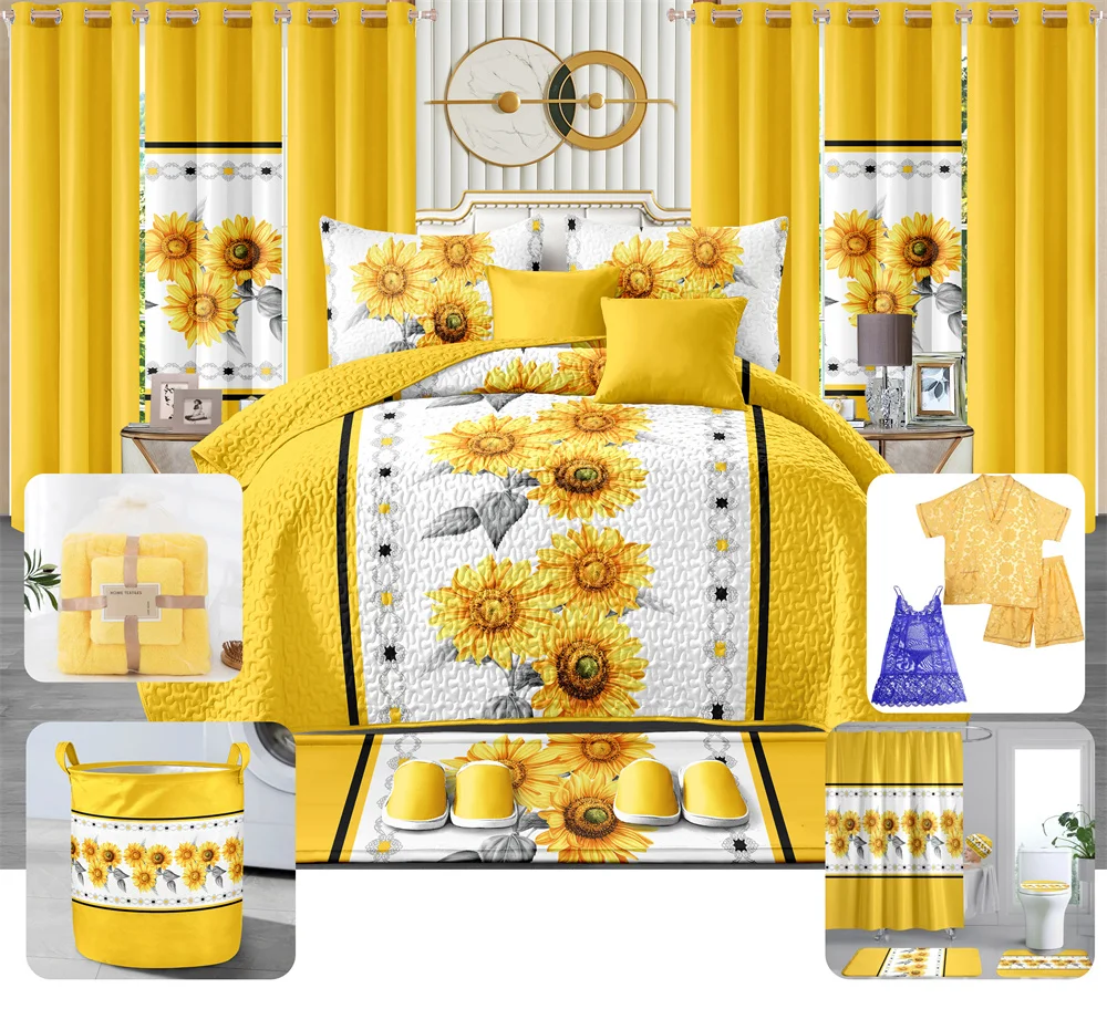 LILIANNA Collections Sunflower Yellow Bedding Set 26 Pieces Bedspread with Curtains Fitted Sheet Pajamas Bathroom Bedding Set