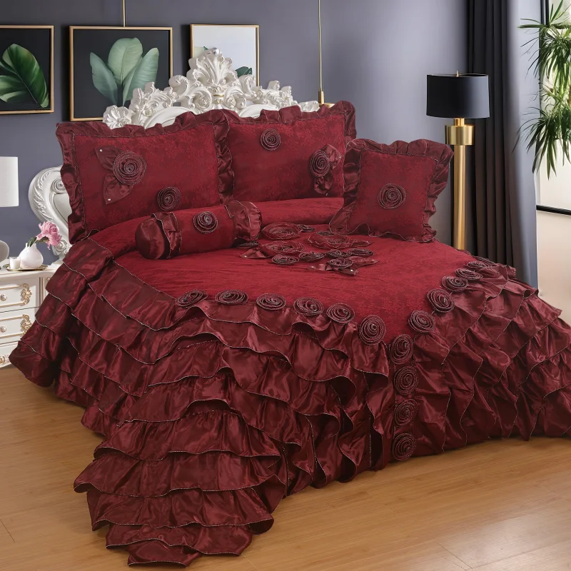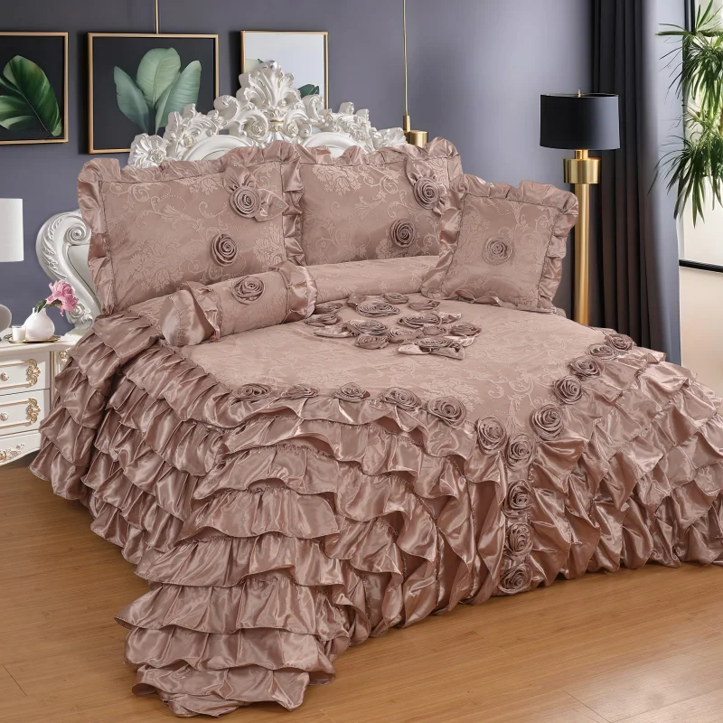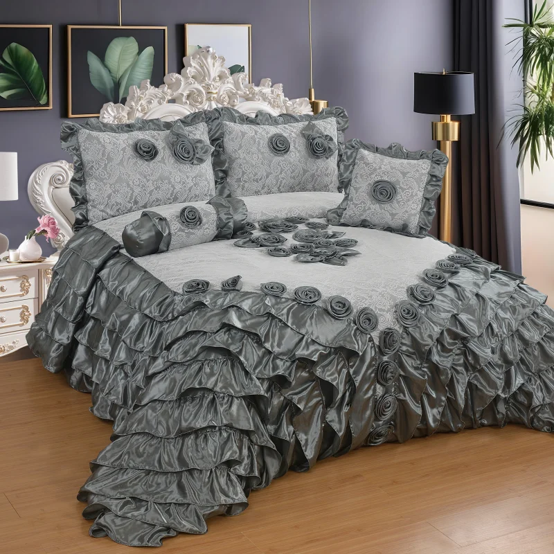 Big Size Ruffled Duvet Cover & Bed Skirt 3D Rose Embroidery 6Pc Luxury Set Silver Patchwork Satin 300tc Eco-Friendly Bedding