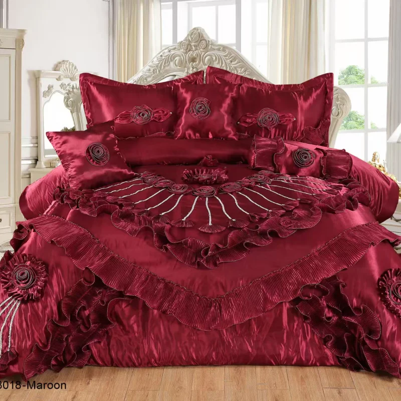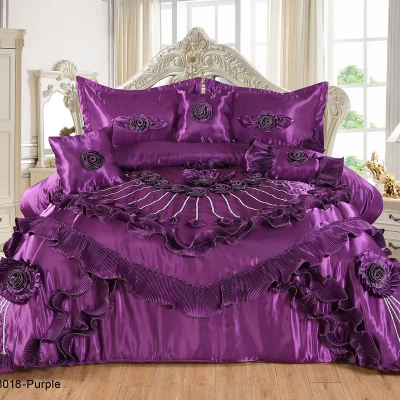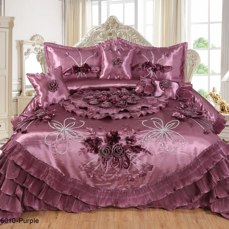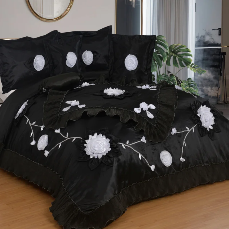 Big Size Ruffled Duvet Cover & Bed Skirt 3D Rose Embroidery 6Pc Luxury Set Silver Patchwork Satin 300tc Eco-Friendly Bedding