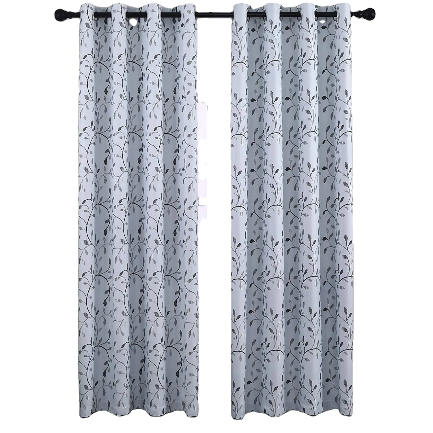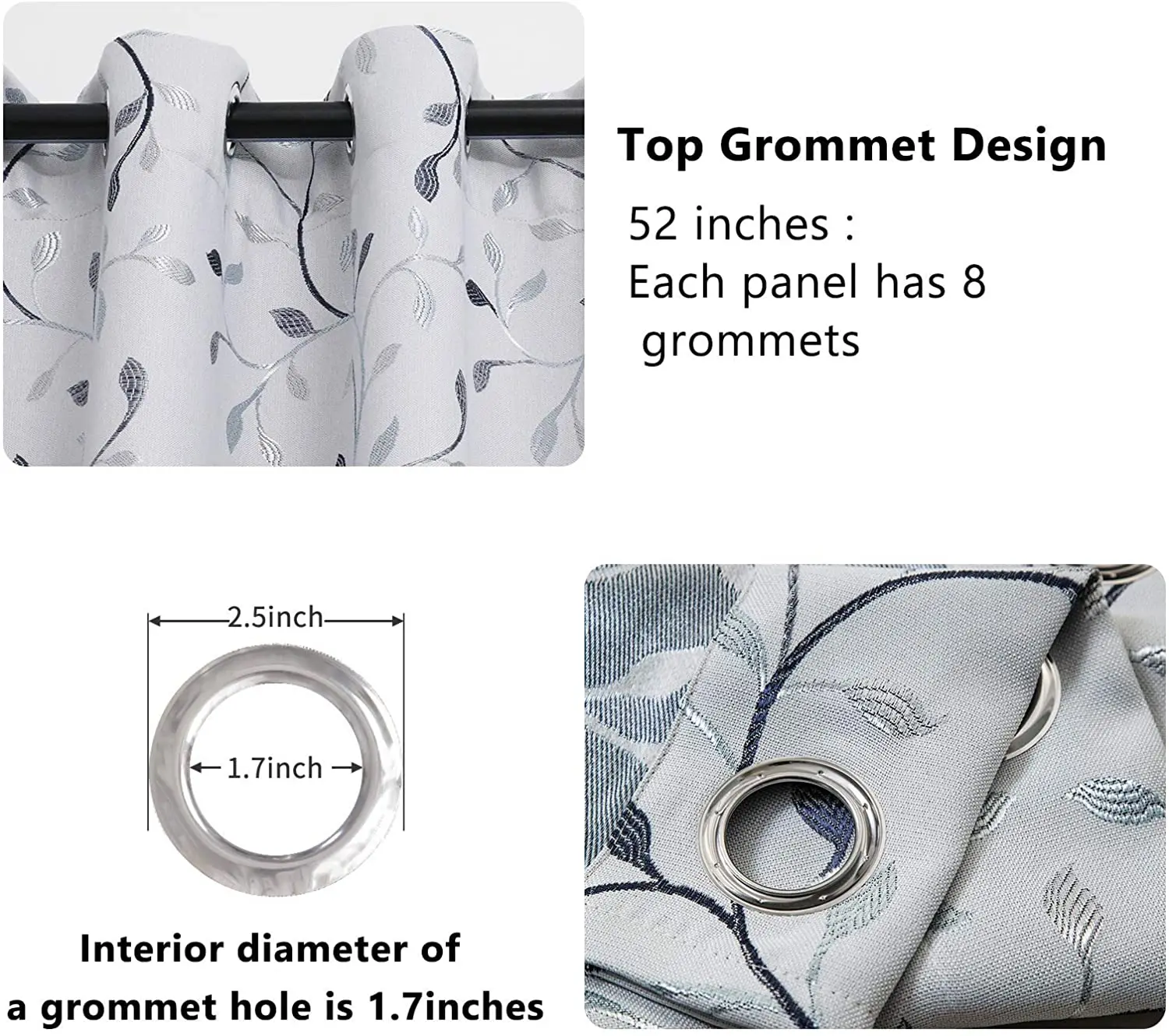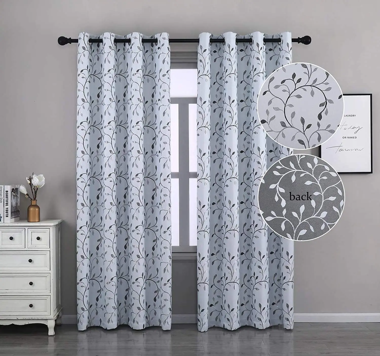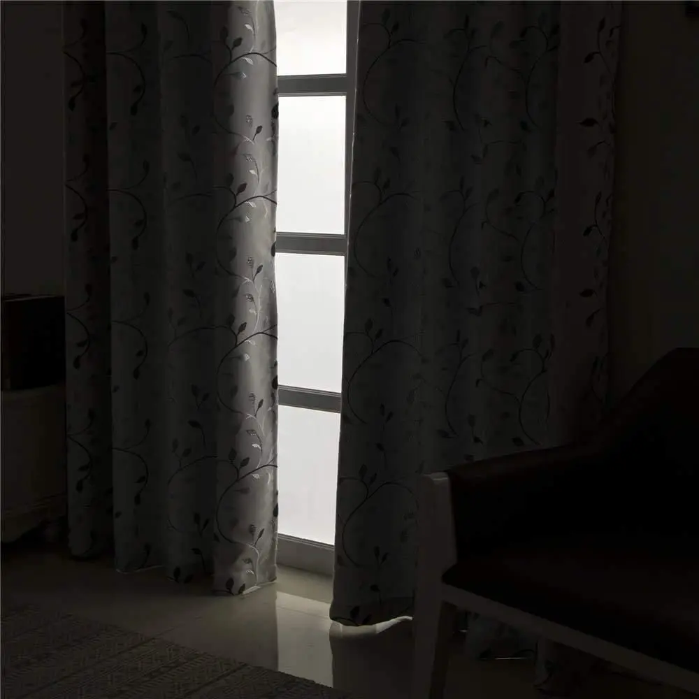 Floral Blackout Curtain With Leaf Embroidery Grommet Top Thermal Insulated Room Darkening Embroidery Window Curtain
