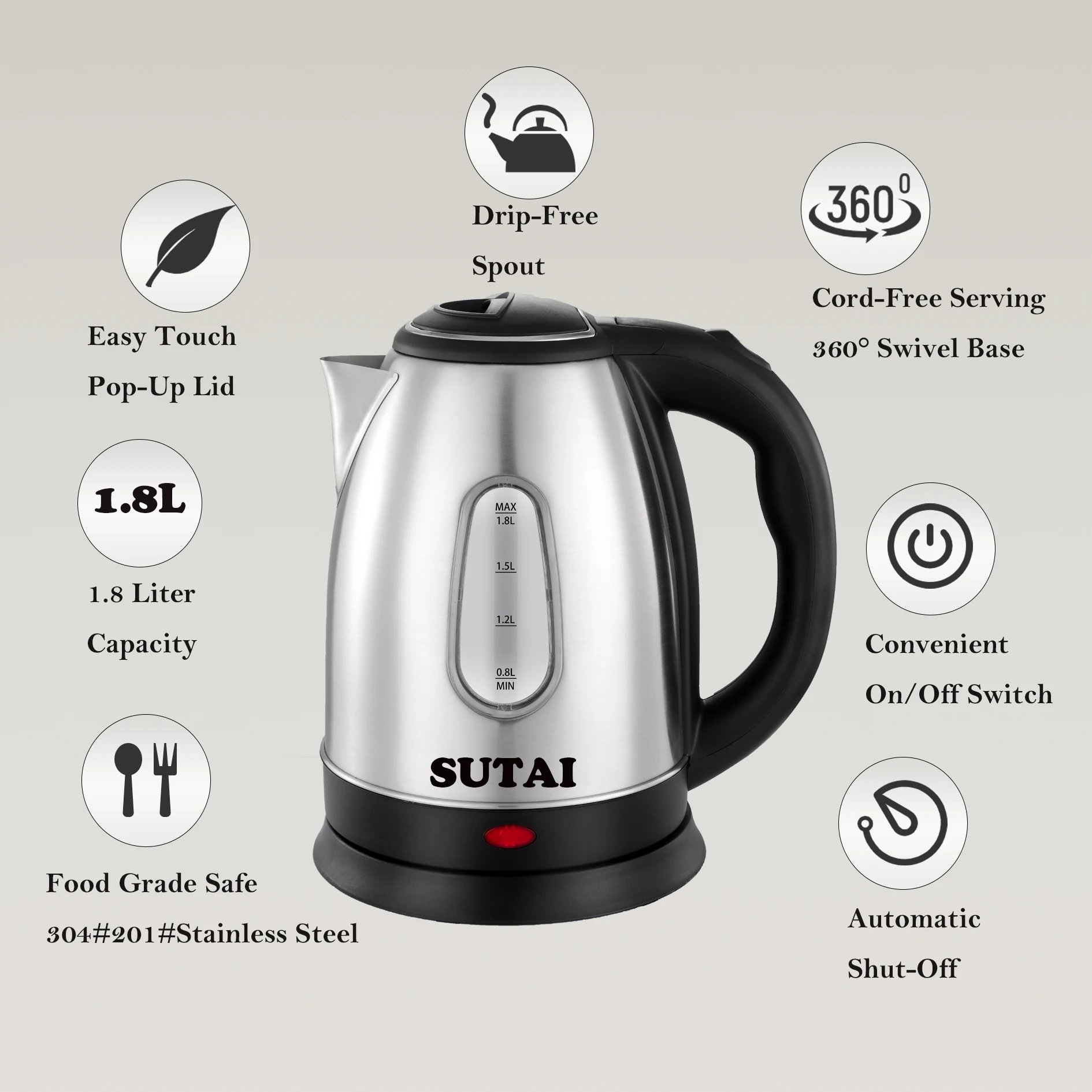 CE High Standard Stainless Steel Household Appliances 1.8 Liters Electric Tea Kettle With Visible Water Window Water Kettle