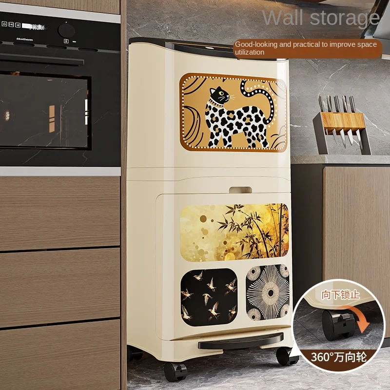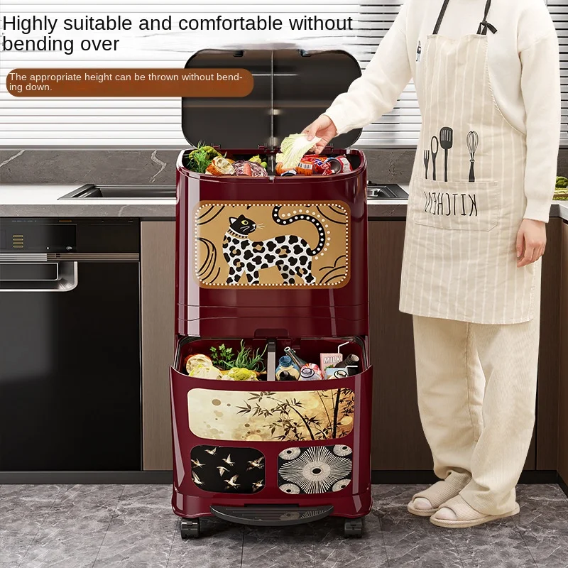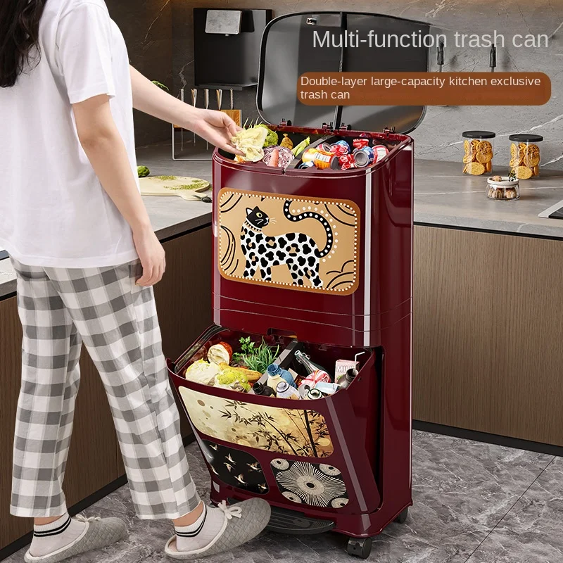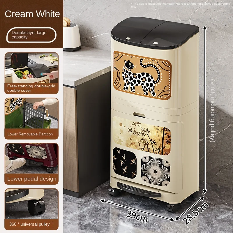 Golden Cat Large Capacity Movable Kitchen Trash Bin Multi-Functional Household Dry Wet Separation Storage Bucket Bent-Free Back