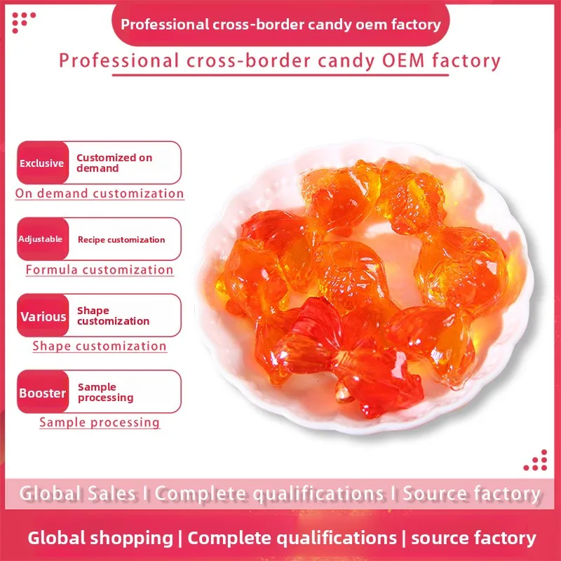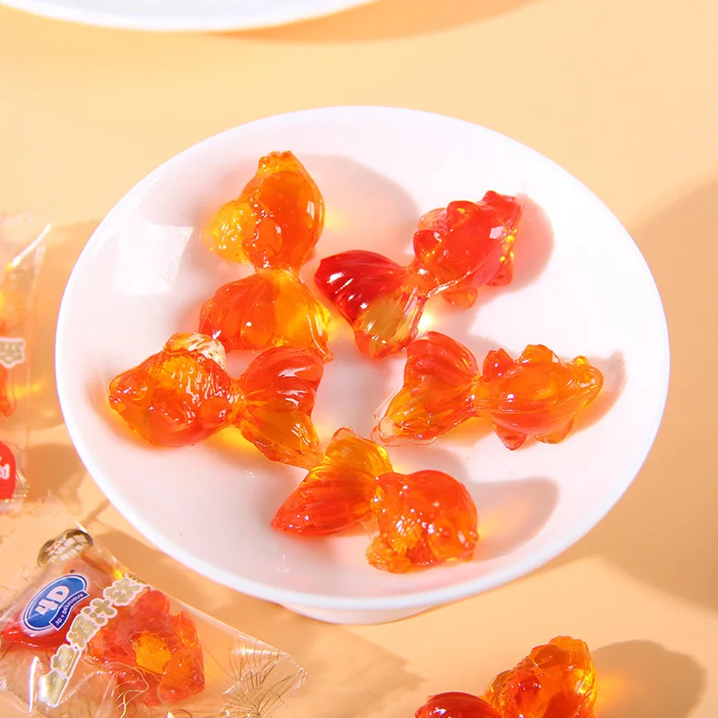 4D Goldfish Koi Gummy Candy Fruity Flavored Bursting Juice Sandwich OEM Snacks with Patterned Coating Bulk Packaging