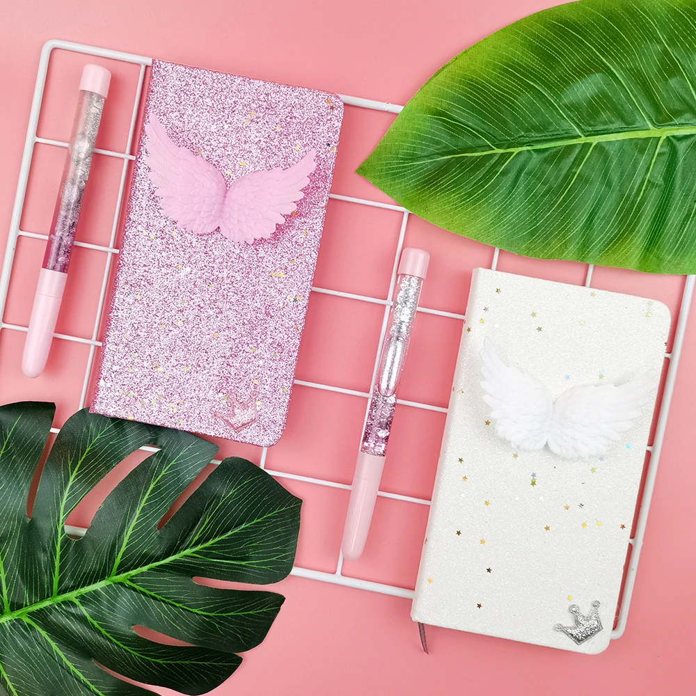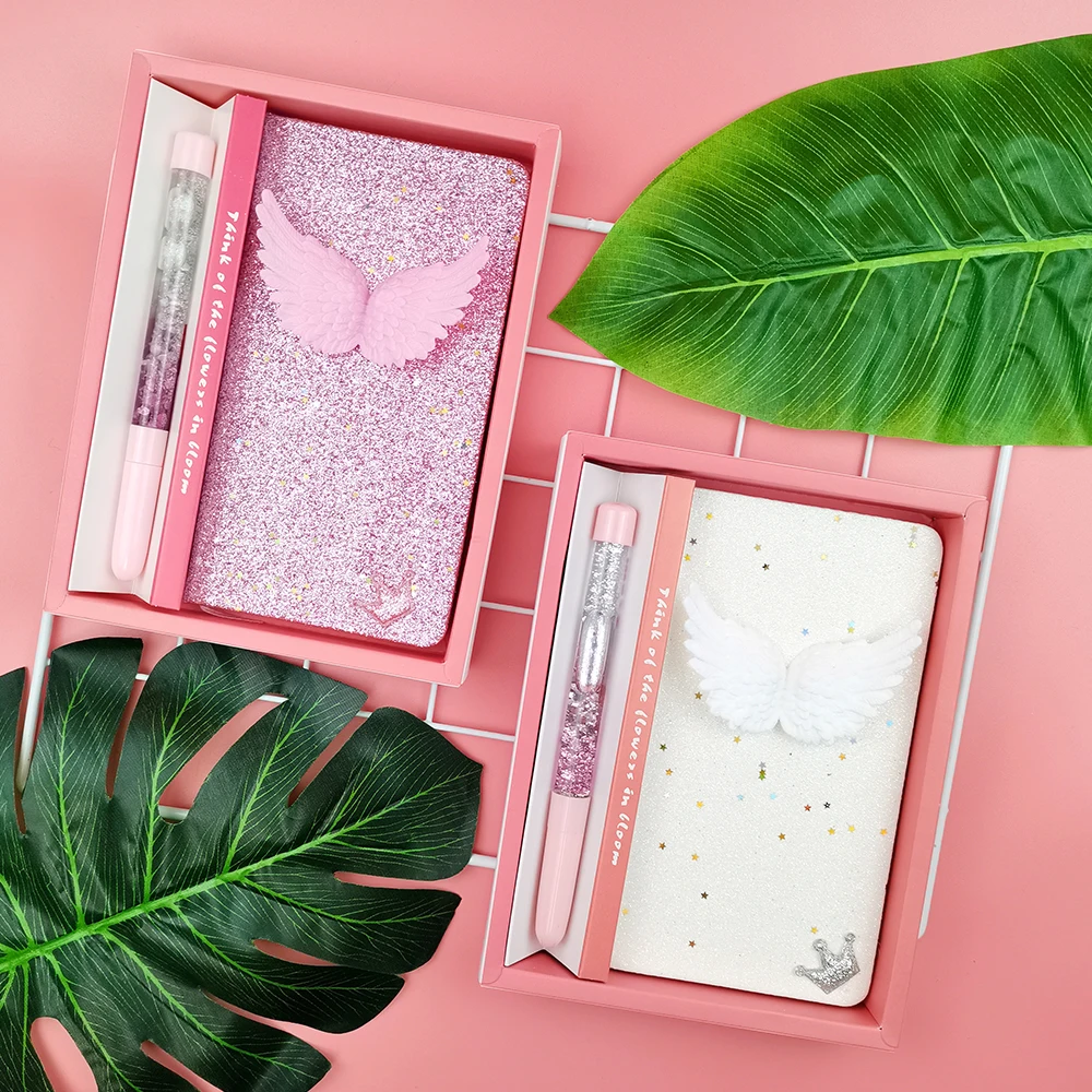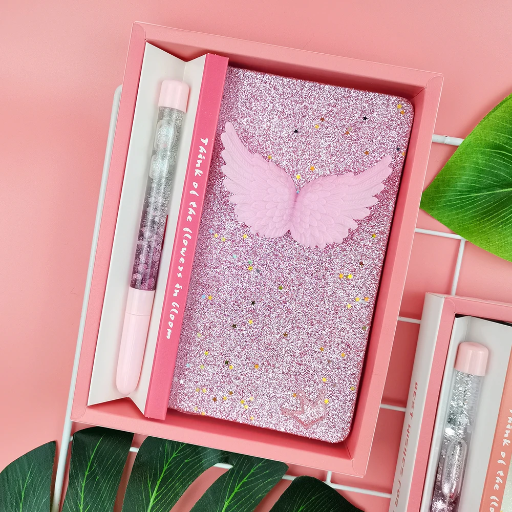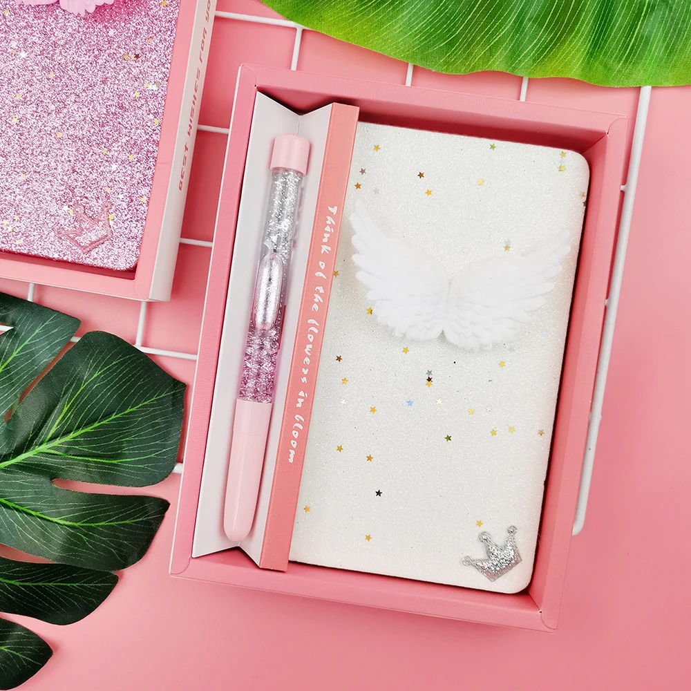Glitter Liquid PVC Cover Pink A6 Notebook Pen Gift Stationery Set Wing Custom Logo Office Style Available PP Paper Cover Box