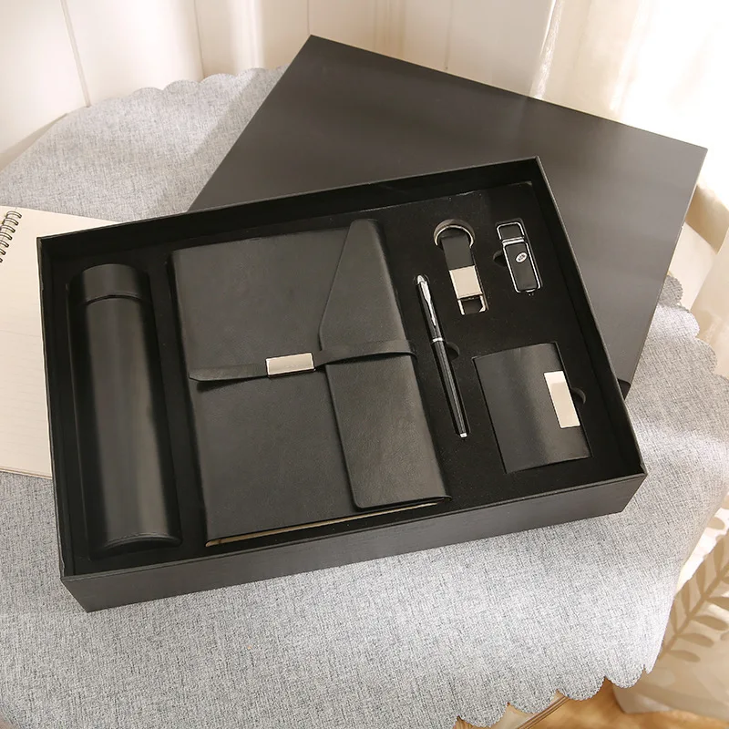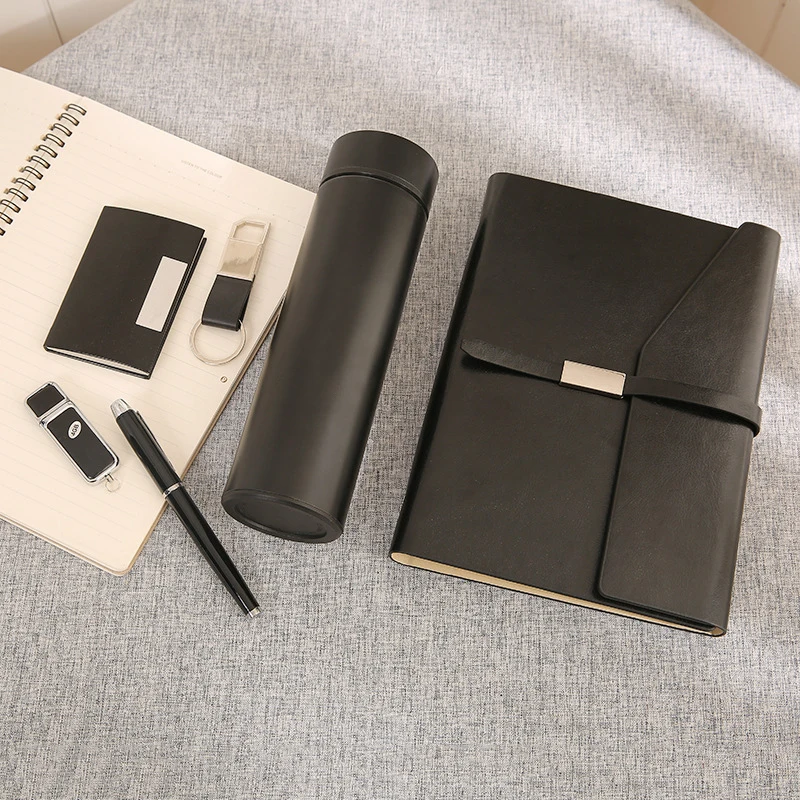 Custom Luxury Black PU Leather Business Notebook Diary Gift Box Set with Logo Vacuum Cup for Promotions and Trade Shows