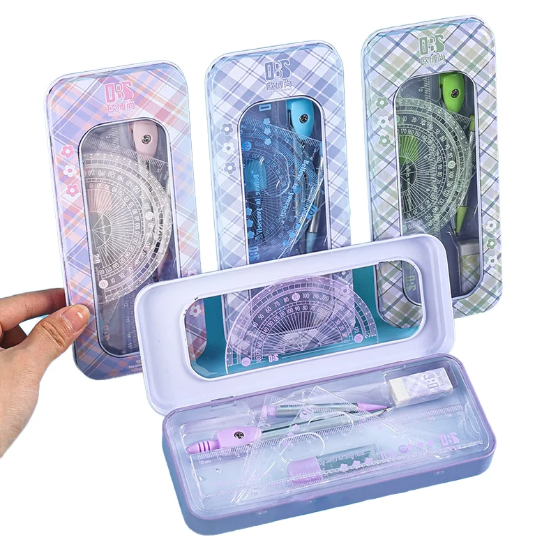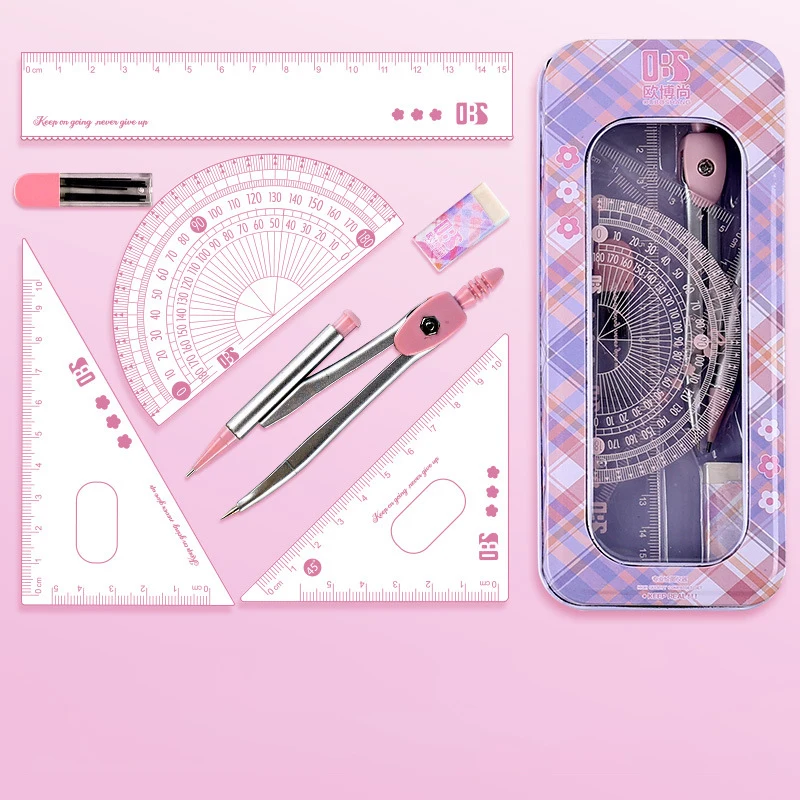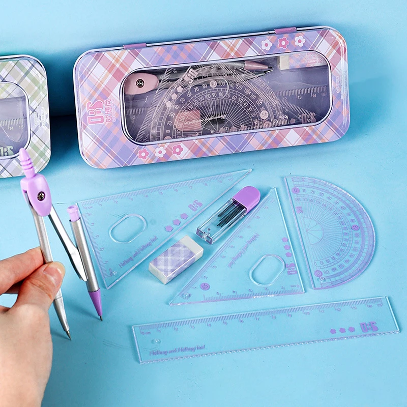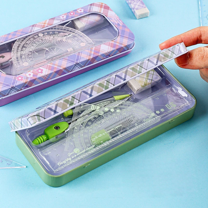 Eight-Piece Stationery Set with Metal and Plastic Office Drawing Rulers School Gift for Students Color Box Packing