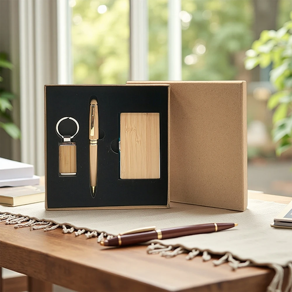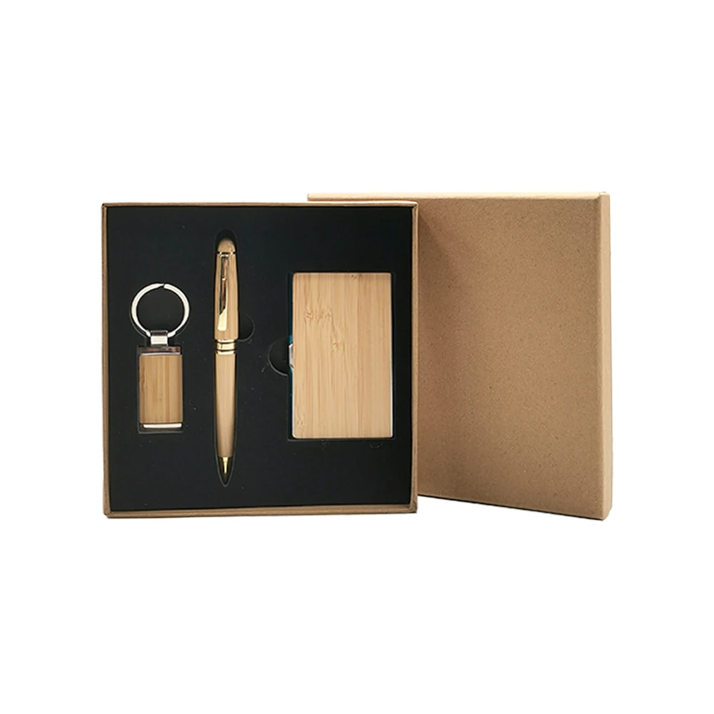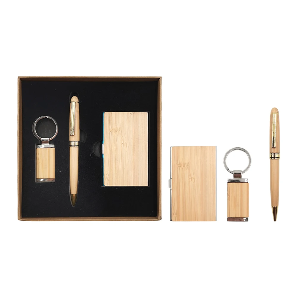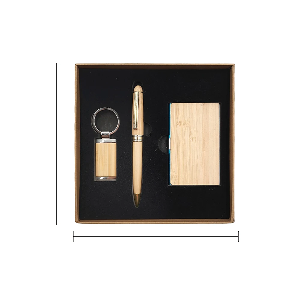 Custom LOGO Bamboo Business Gift Set Promotional Cardholder Keychain Pen for Teachers and Office Staff