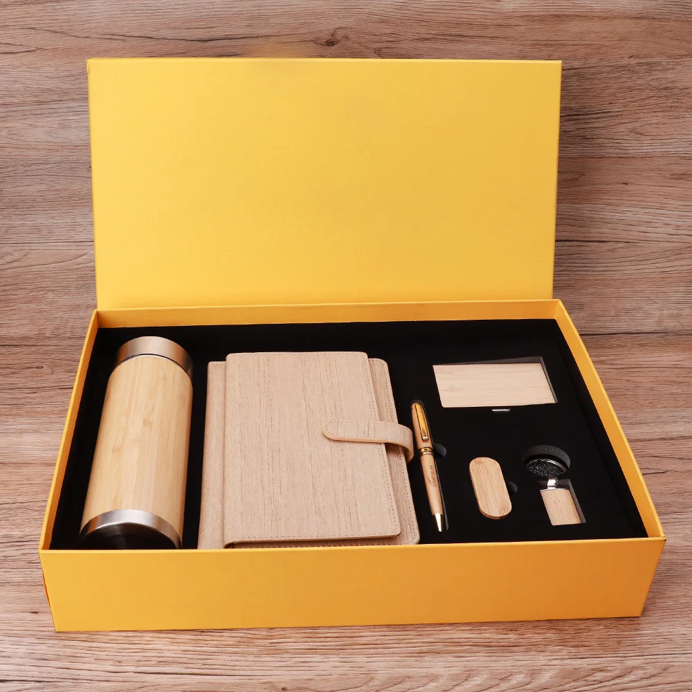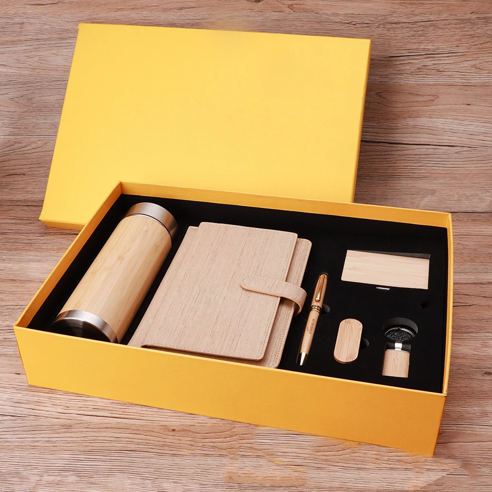 Custom Promotional Business PU Leather Journal Notebook A5 Bamboo Bottle Gift Set