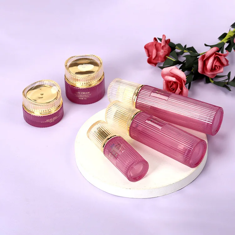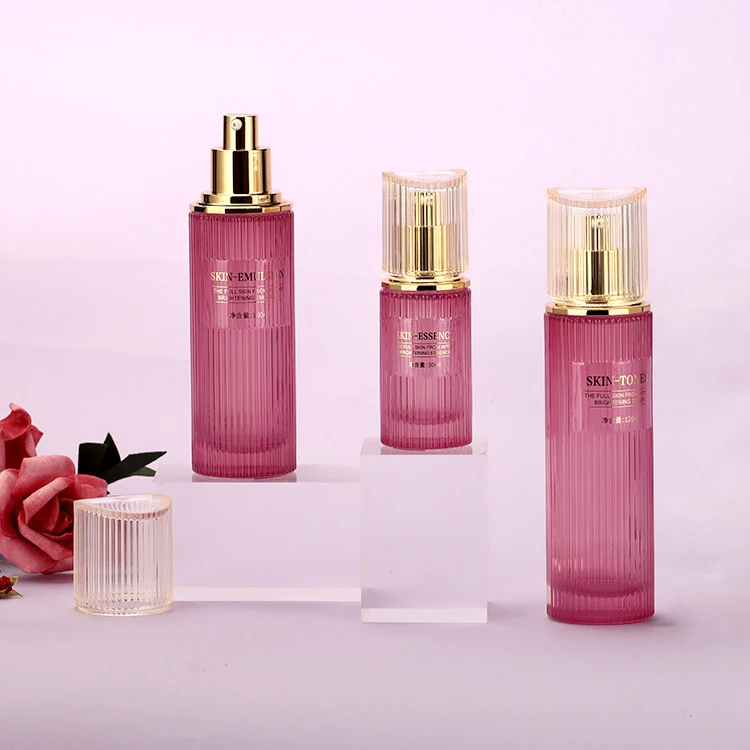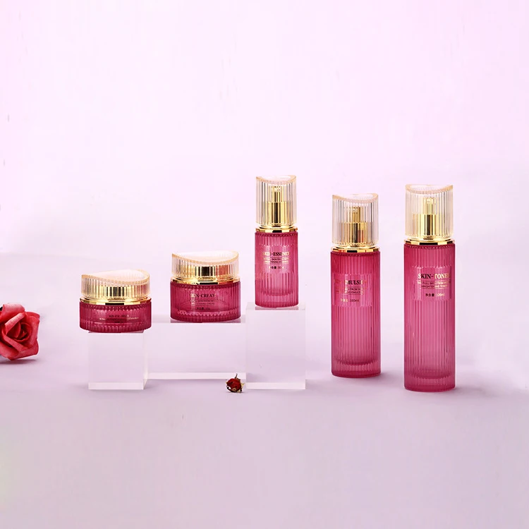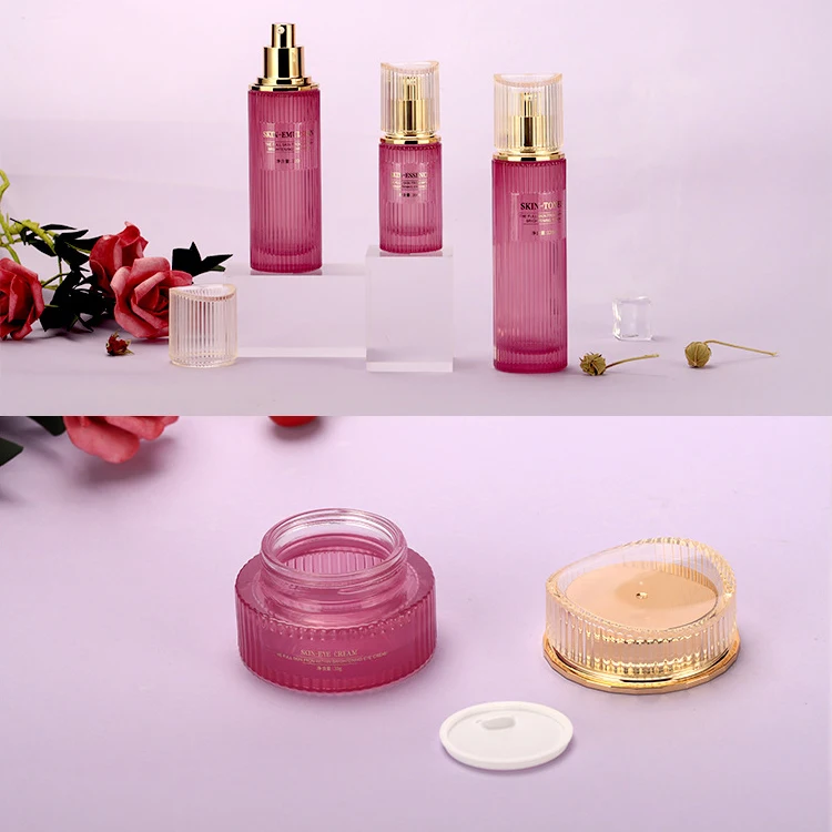 New Luxurious Vertical Stripe Set Glass Bottle 1OZ Lotion Bottle 30g 50g High End Rose Red Translucent Cream Bottle Jar