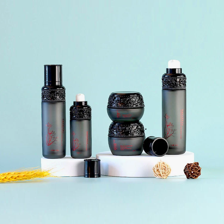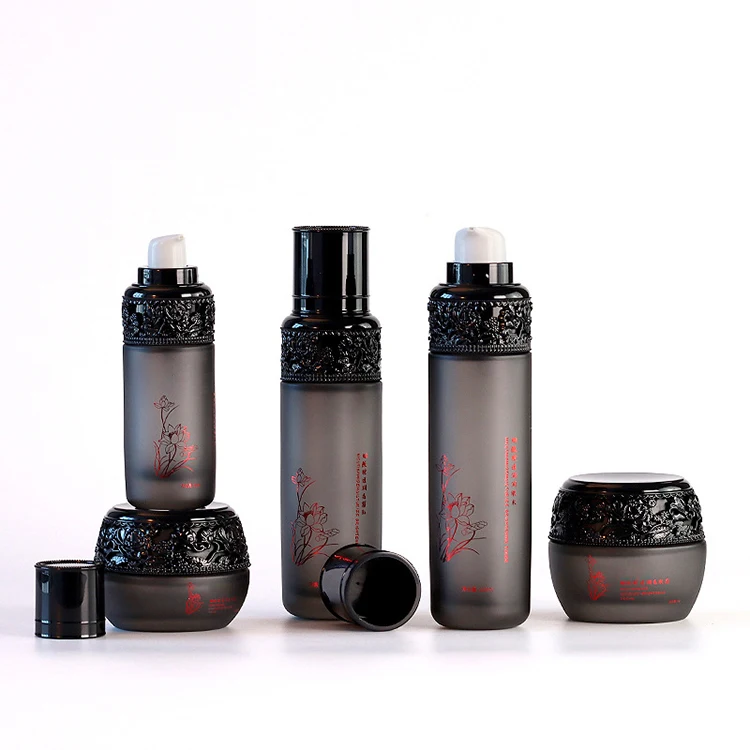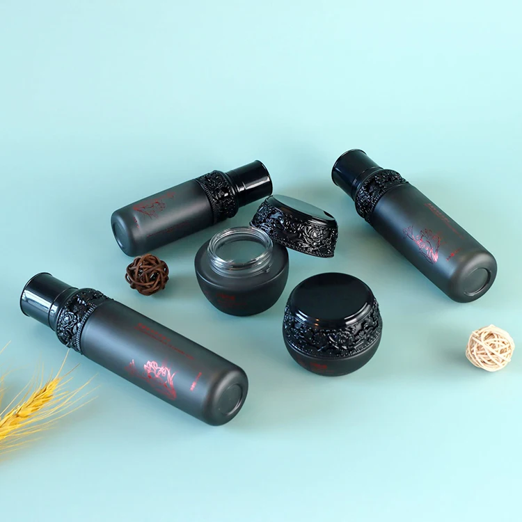 High-End 100ml Glass Pump Bottle Black Carved Lid 40ml Lotion 30ml Dropper Unique Middle Eastern Islamic Design Screen Printing
