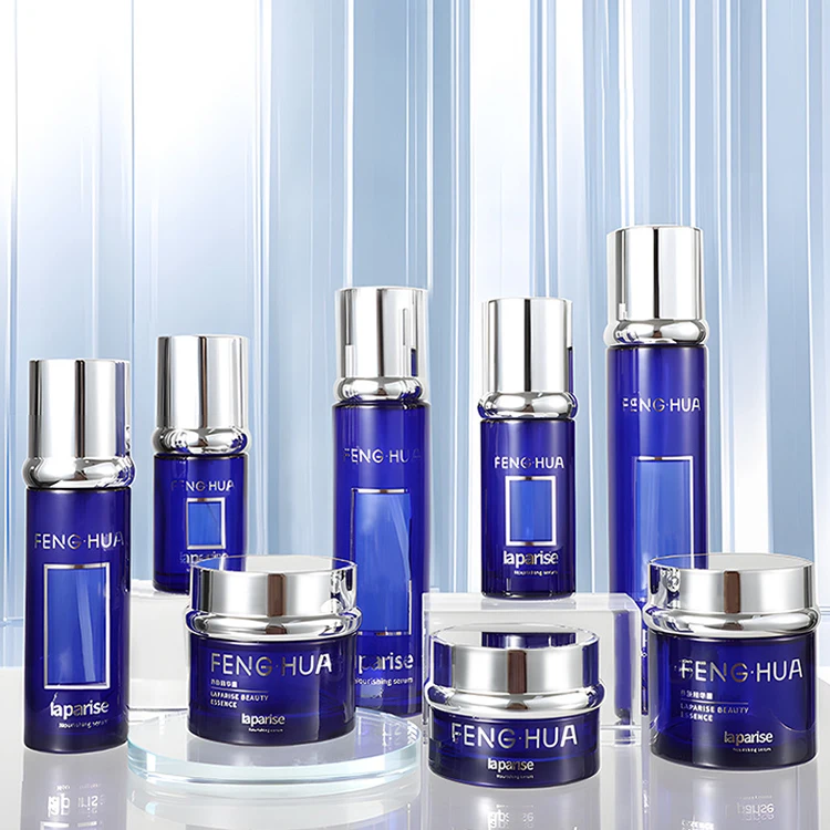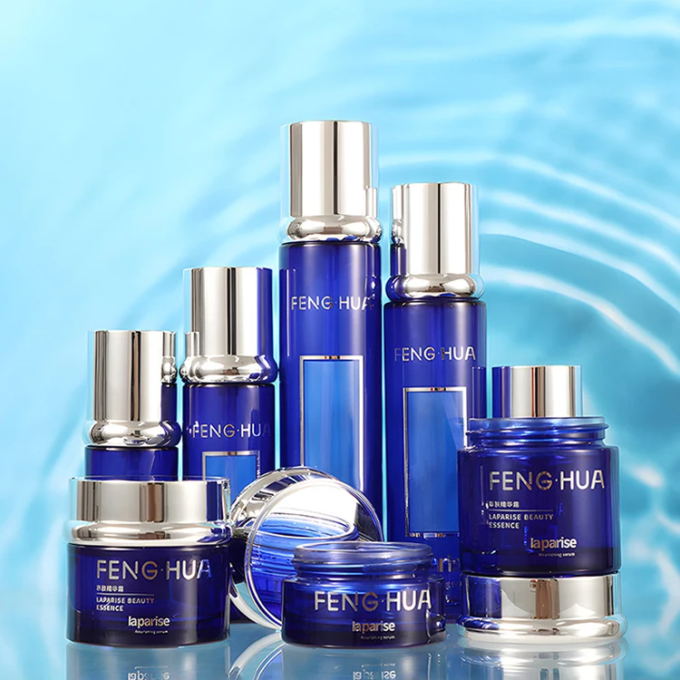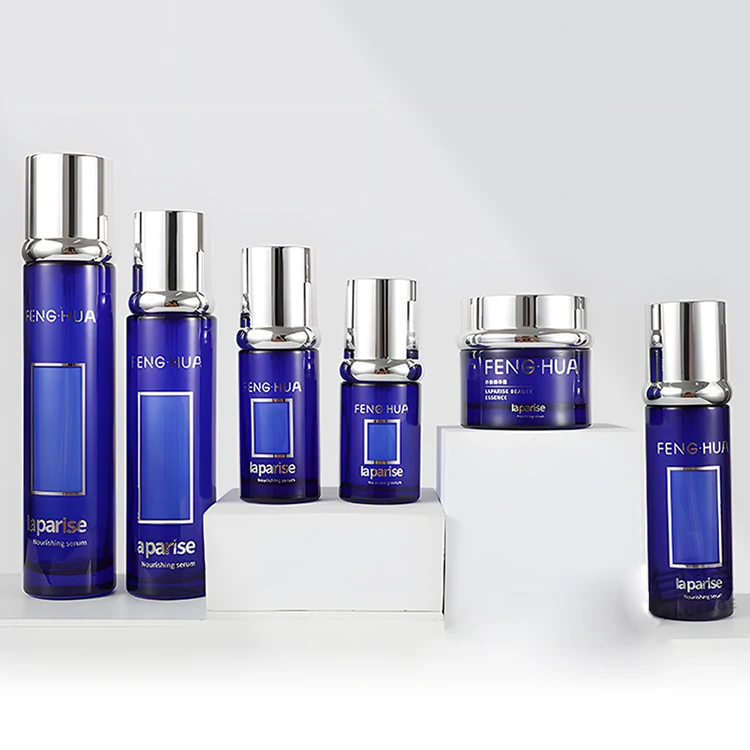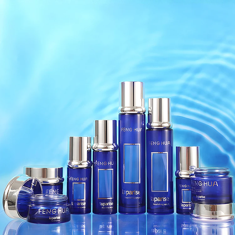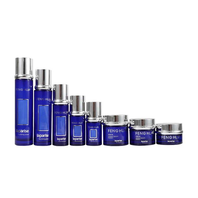Wholesale Luxury Blue Glass Jars for Cosmetics Empty Flat Face Lotion Containers with Lids Cream Packaging
