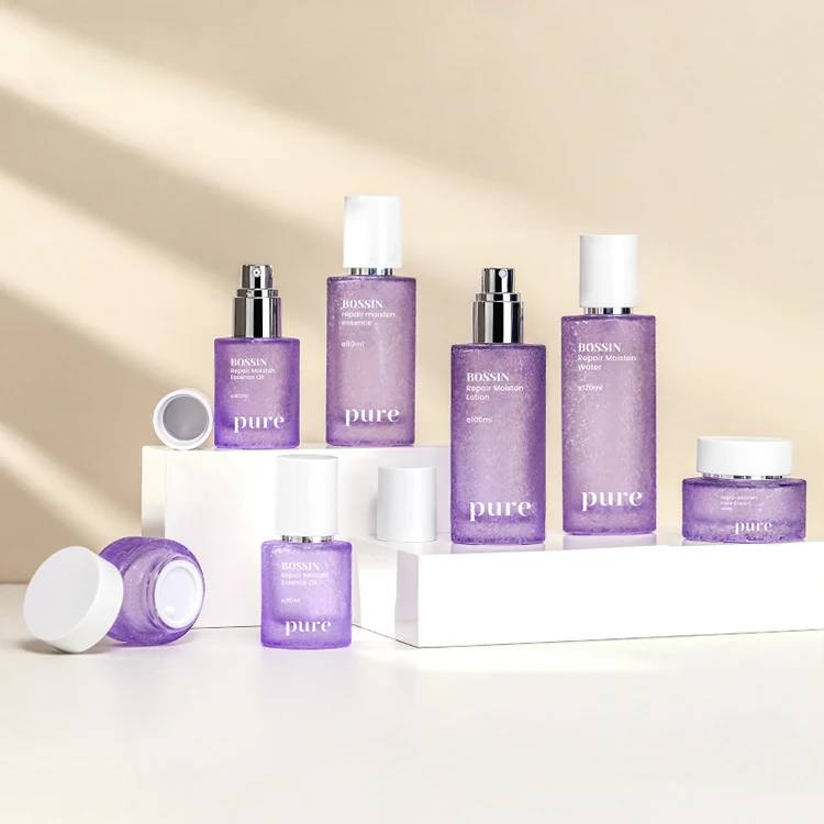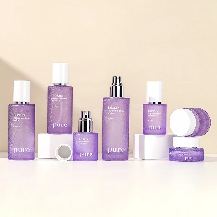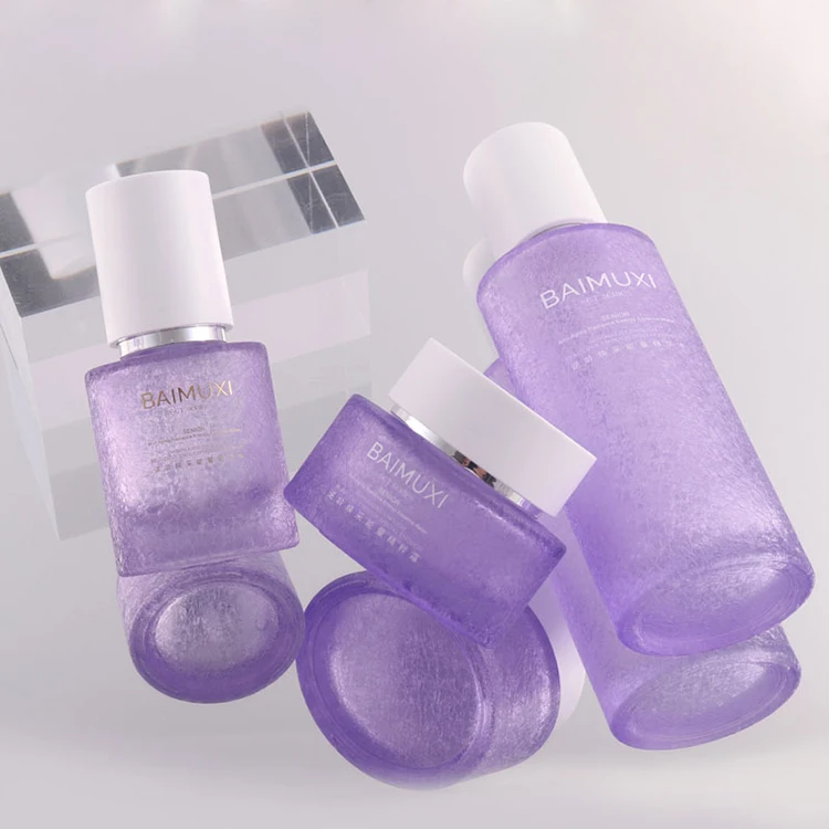 Purple Set Custom Spray Bottles and Face Cream Jar Toner Lotion Pump Skincare Packaging Purple Glass Cosmetic Bottle and Jar