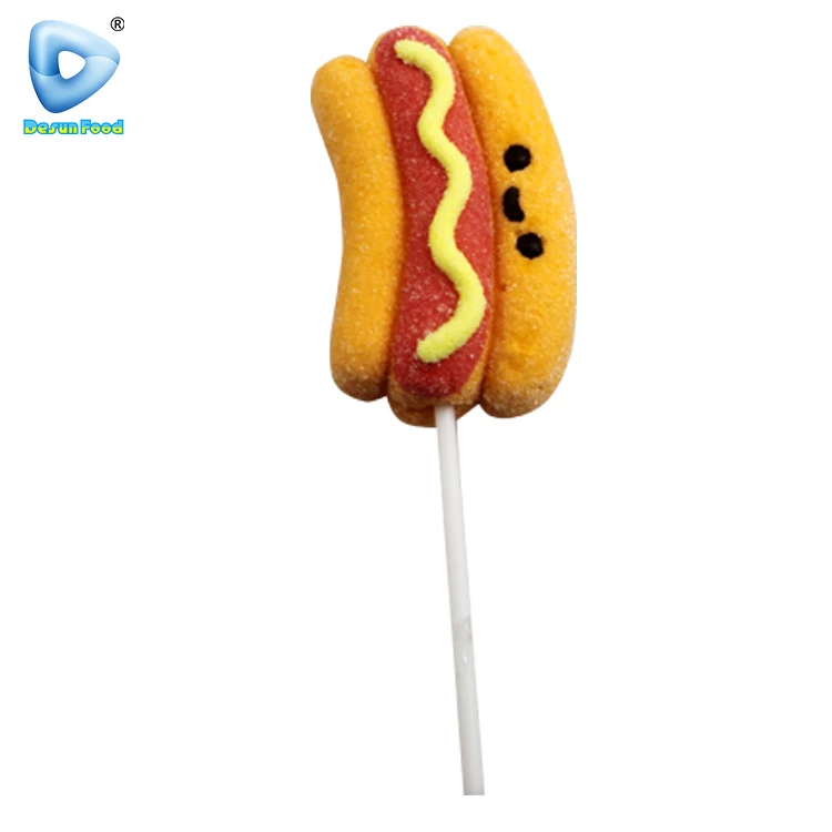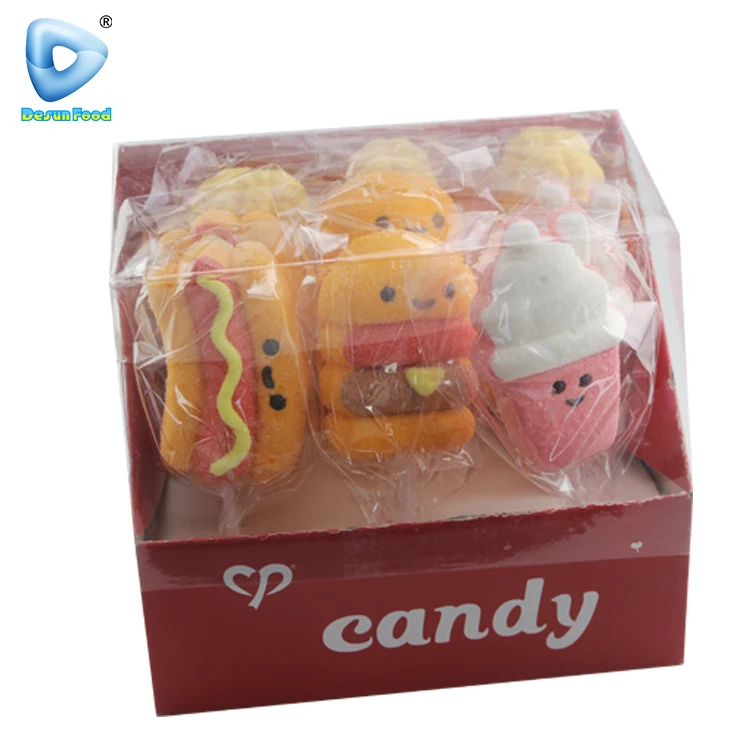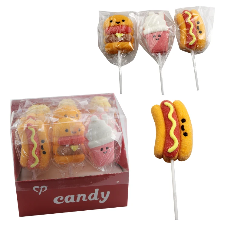 Hot Selling Cartoon Hamburger Hot Dog Shape Fruit Flavor Marshmallow Lollipop Candy