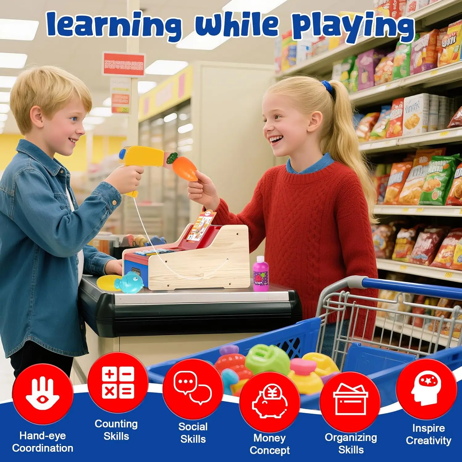 EPT Pretend Play Calculator Cash Register Toys Scanner Rechargeable Wooden Cash Register for Kids
