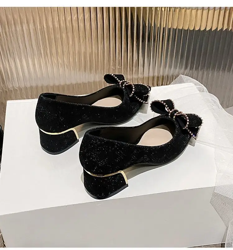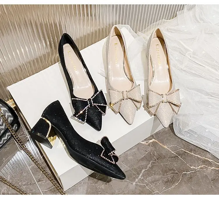 Women's Elegant PU Rubber Hoof Heels Comfortable Pointed Thick Bow Design Fashionable Office Sandals Spring Anti-Slippery