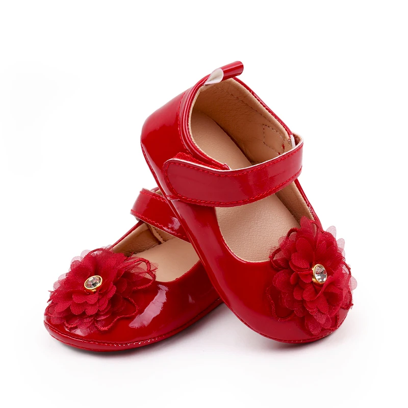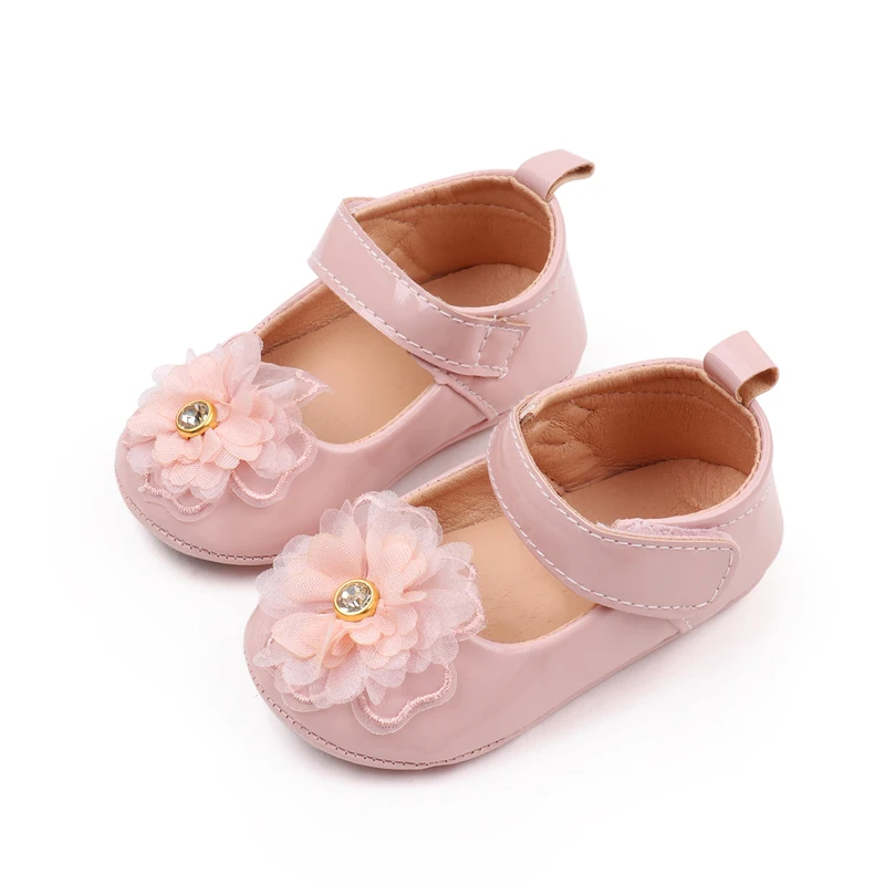 Spring and Autumn Pure Color PU Leather Veil Rhindiamonds Flower Princess Walking Shoes for Baby Girls