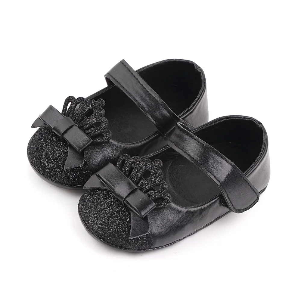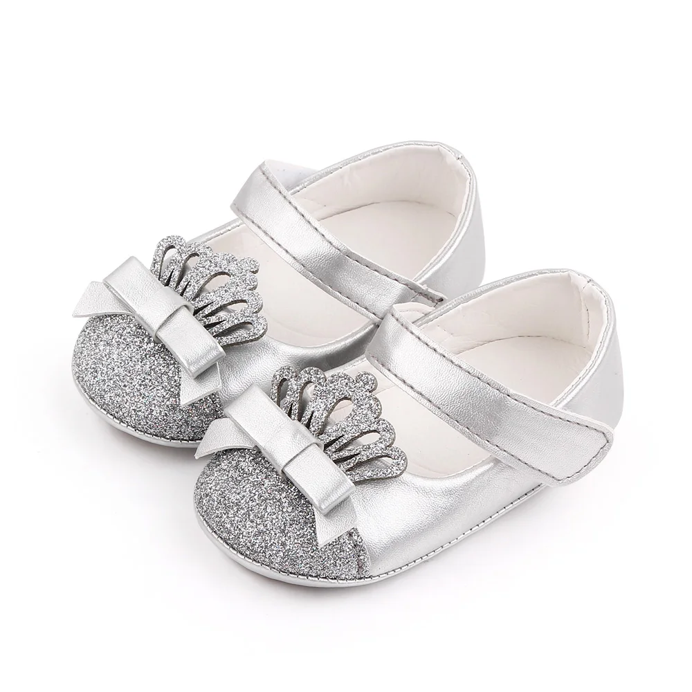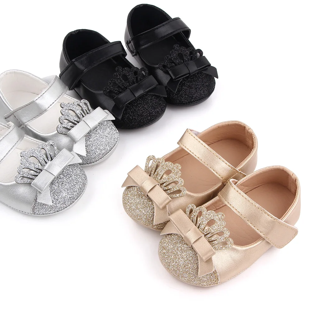 Shiny Solid Color Glitter Crown Bow Decorated Infants Princess Shoes for Baby Girls