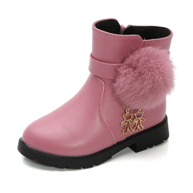 2026 Fashion Girl's Leather Snow Boots with Plush Fur Ball for Winter Season Zip Boots