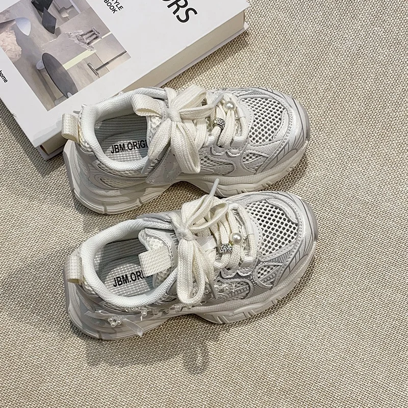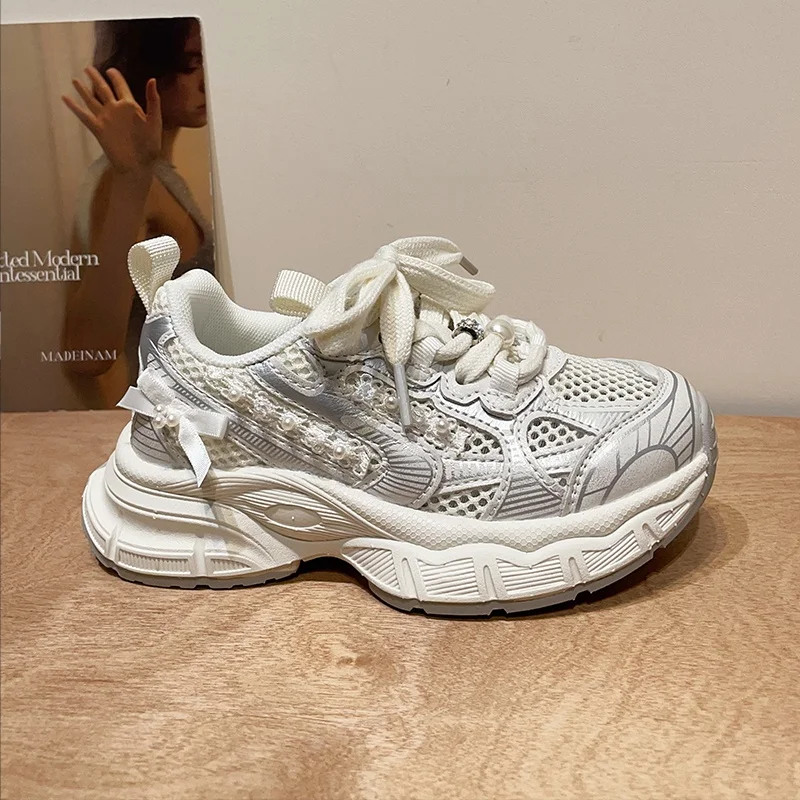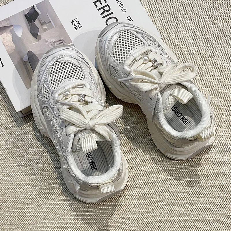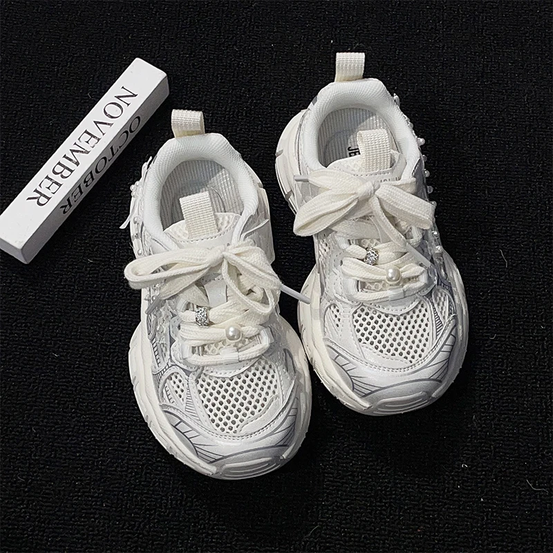 TBS Korean Version Spring New Kids' Sport Shoes Stylish Princess Sneakers Pearl Lace Mesh Breathable Shoes for Girls