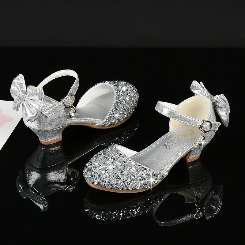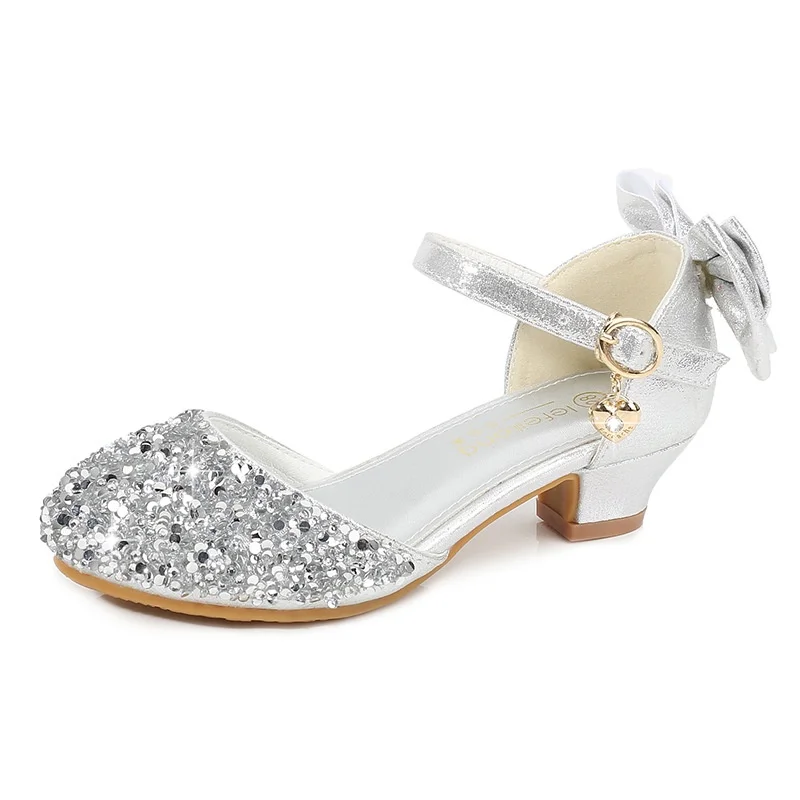 Girls High Heels Princess Leather Performance Party Shoes Sparkle Bow Design Crystal Children's Dress Shoes