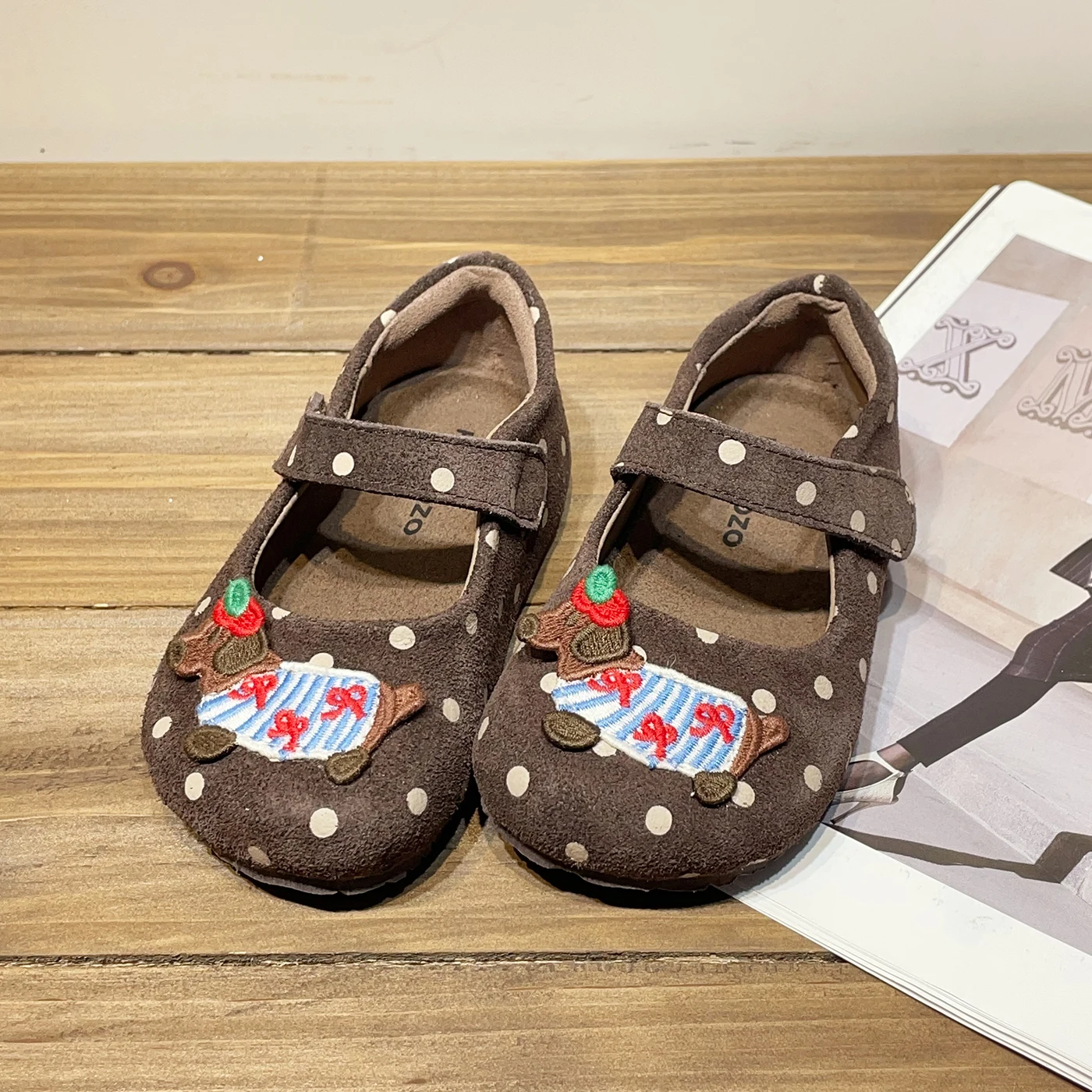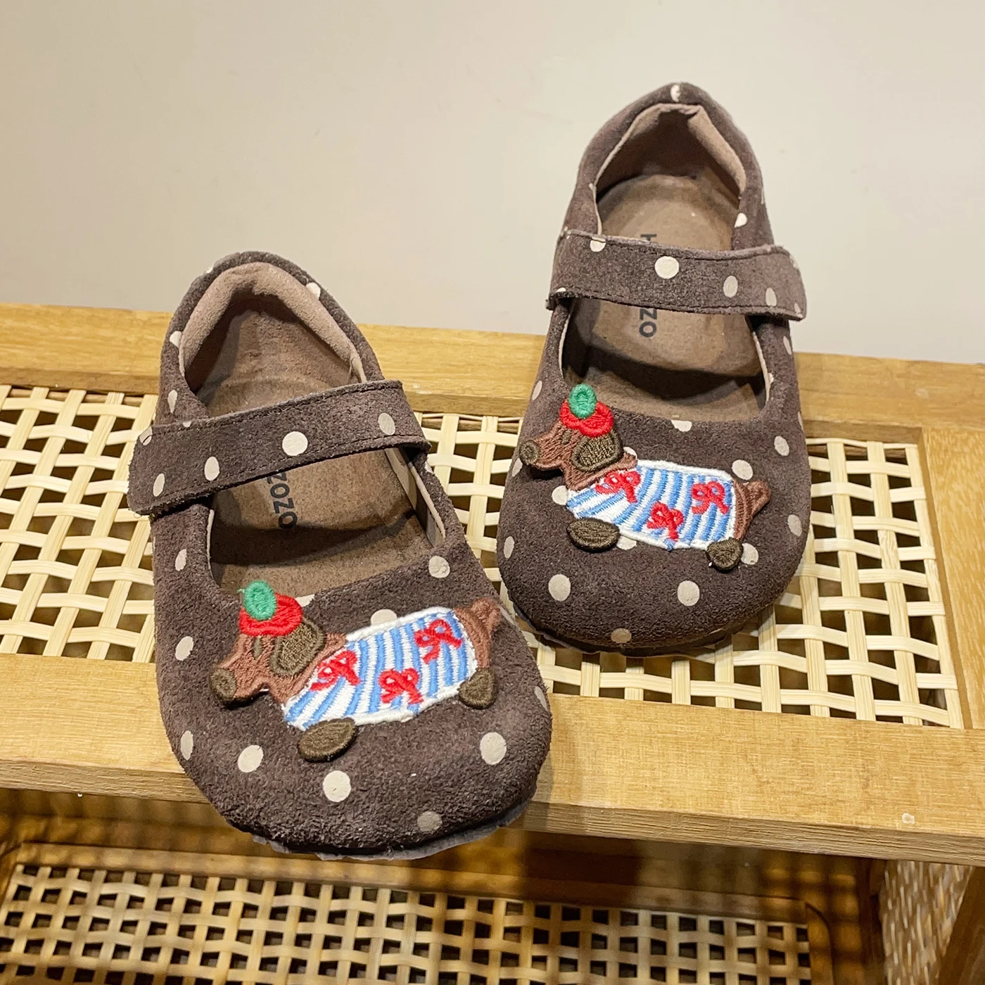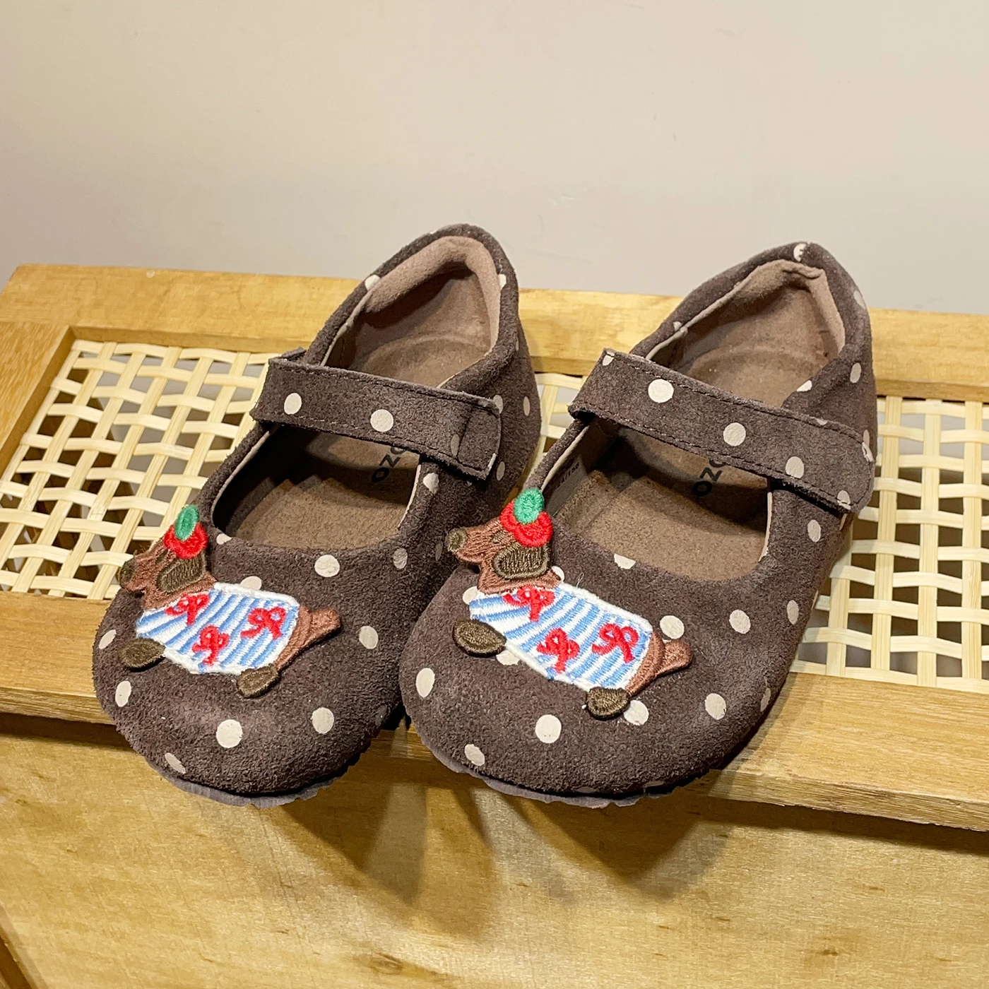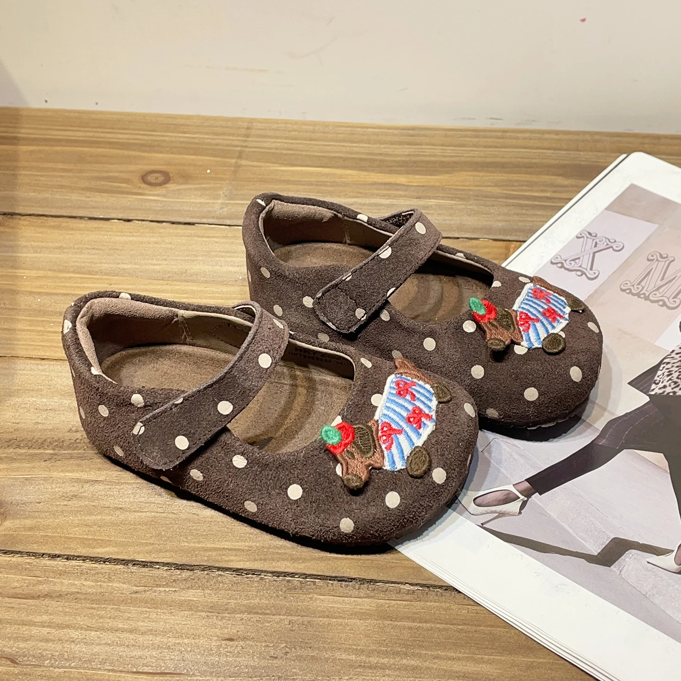TBS Autumn Casual Girls Dance Dress Shoes for Birkenstock-Style Suede Retro Polka Dot Soft-Soled Slip-On Baby Girls Flat