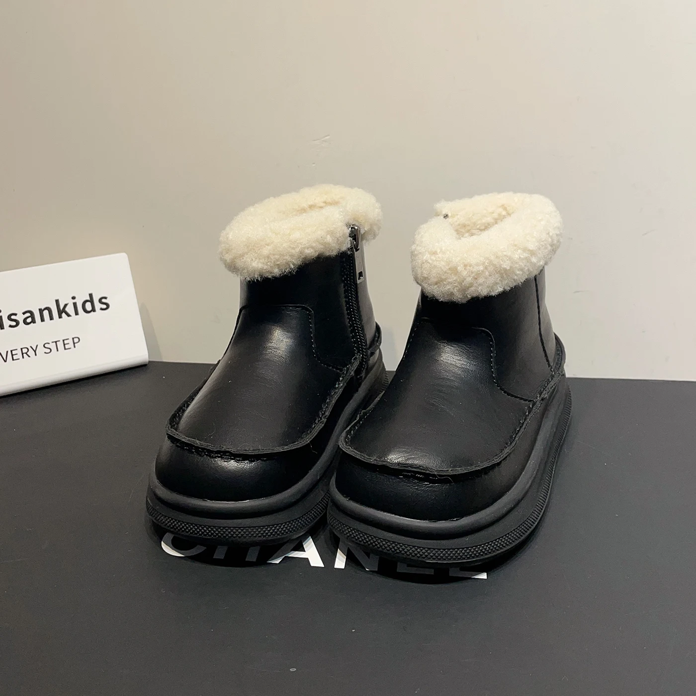 TBS Children's Fleece-Lined Thickened Snow Boots Side Zipper Non-Slip Fashionable Leather Boots