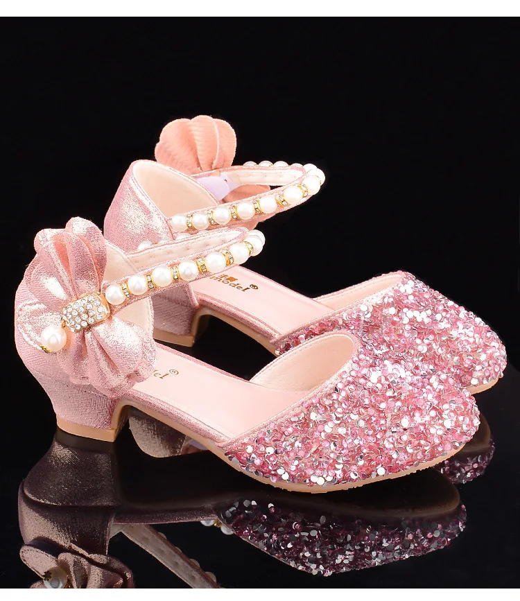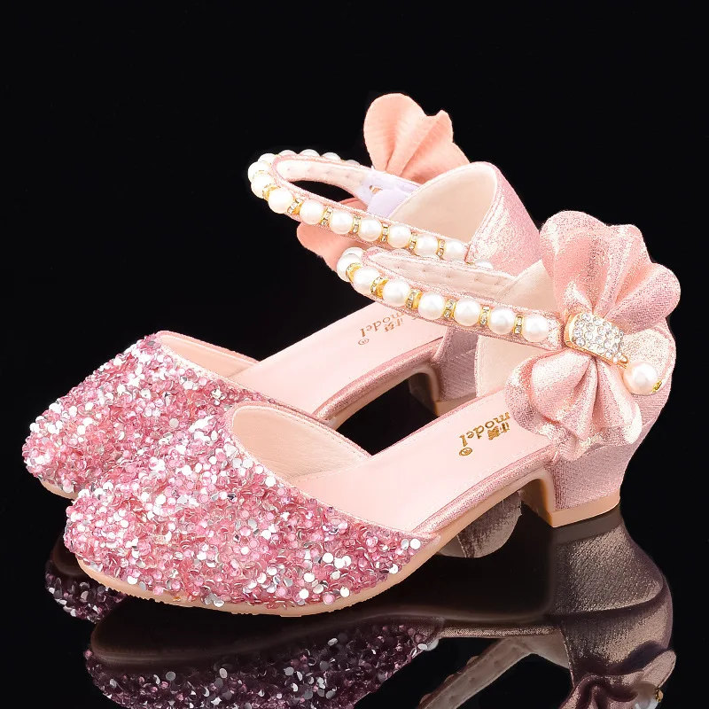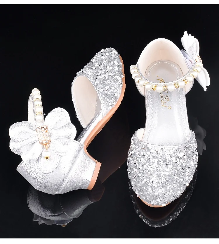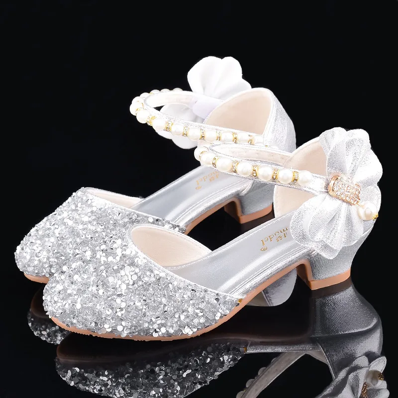 Silver Girls High Heel Princess Dress Shoes Sequins Bow Design Casual Party Shoes