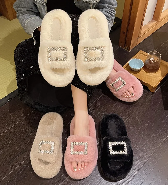 Korean Styles Plus Size Rhinestone Fluffy Slippers Fall Winter Ladies Indoor Elegant Warm Slippers Fashion Faux Fur Slippers
