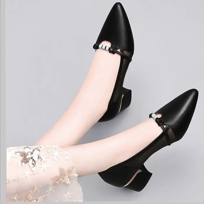 Shallow Mouth Beaded Decoration Pointed Shoes for Women 2026 Spring & Autumn Breathable Fashion Thick Heel slip on Sandal Shoes