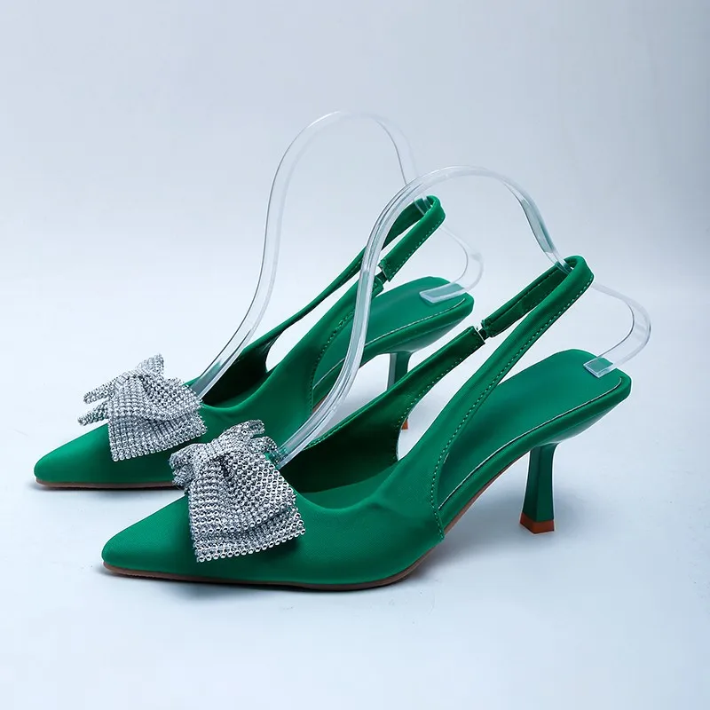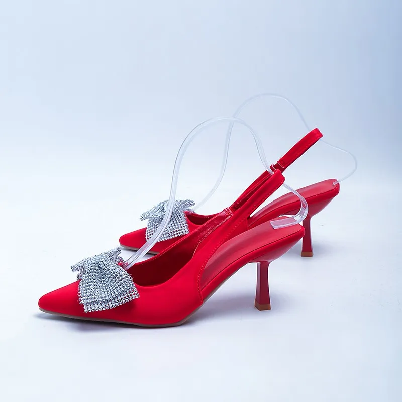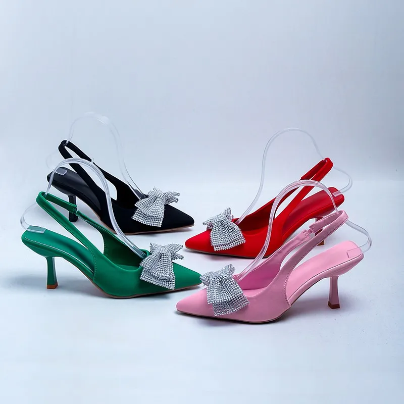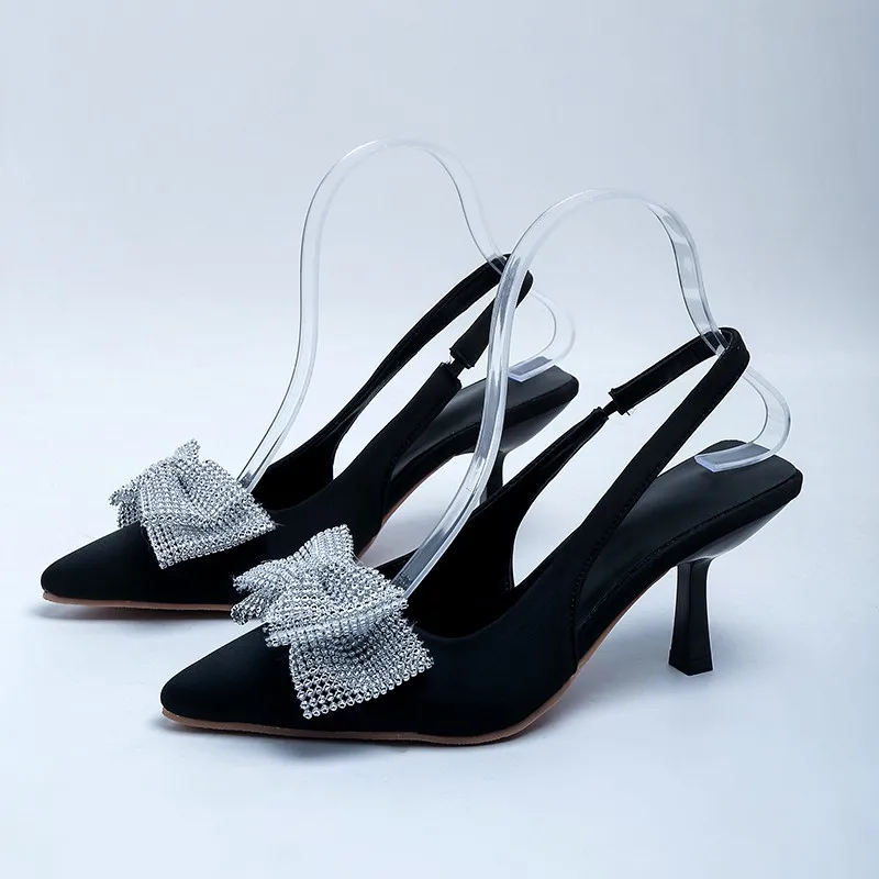 Custom Logo Ladies One Line Buckle Sandals Shoes Sexy Pointed Rhinestone Bowknot Women's Stiletto Heels Slingback Shoes