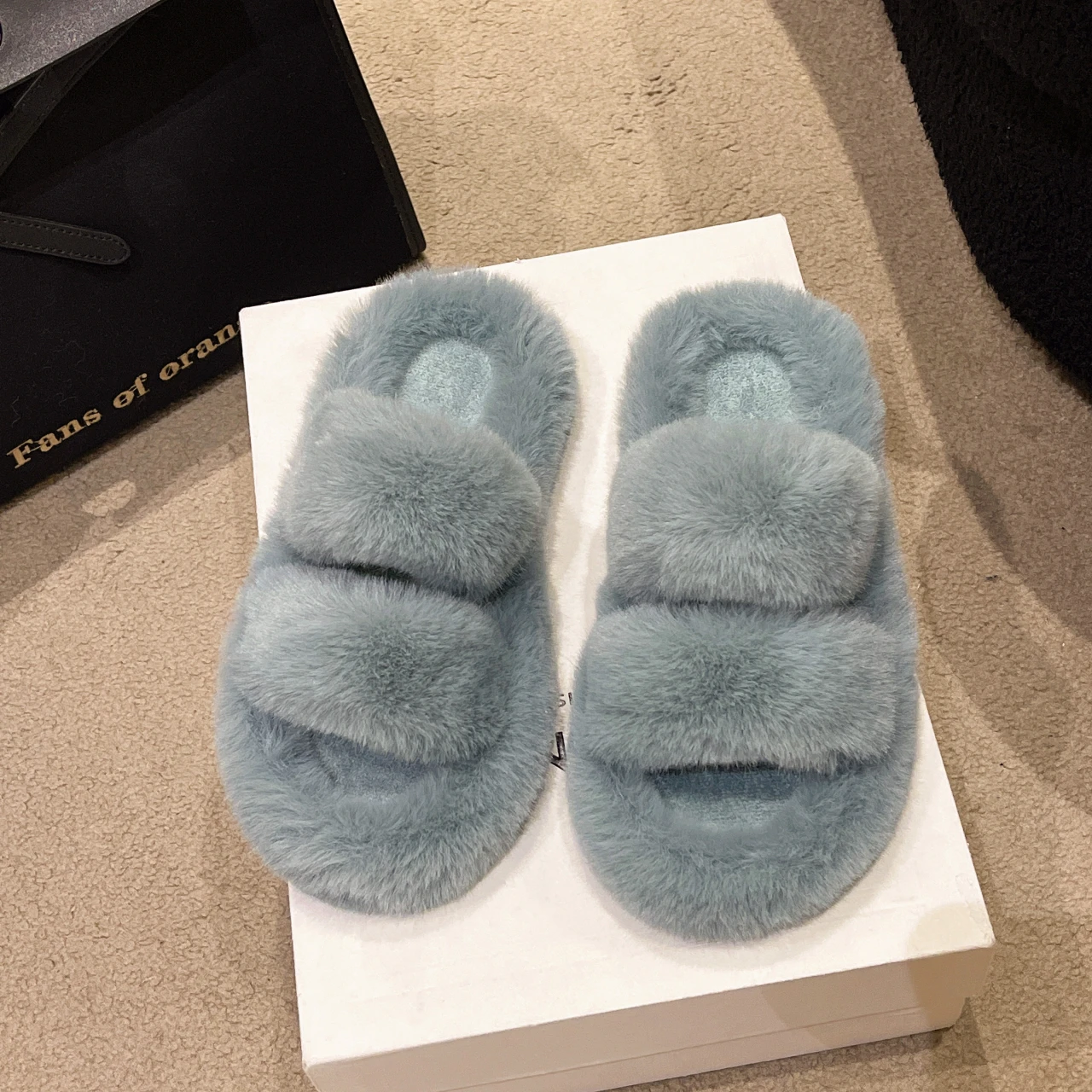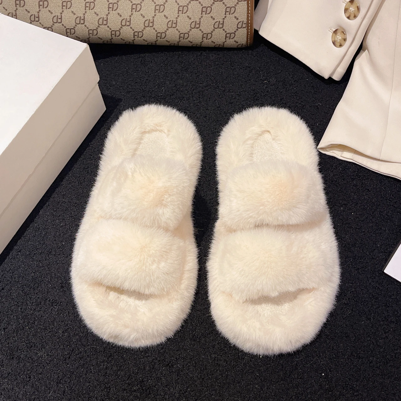 Custom Logo Women's Fur Slippers Factory Wholesale 2 Straps Soft Warm Fur Slides Home Cheaper Flat Furry Slipper