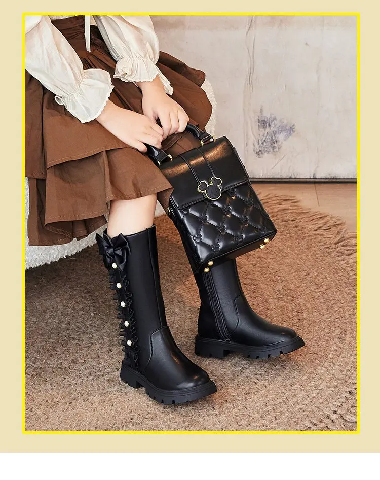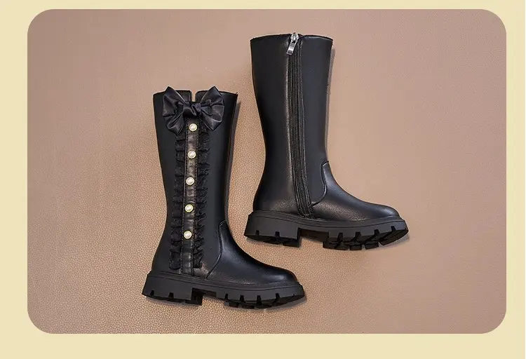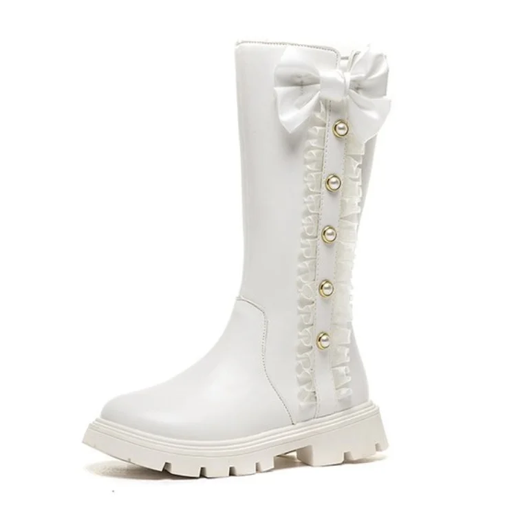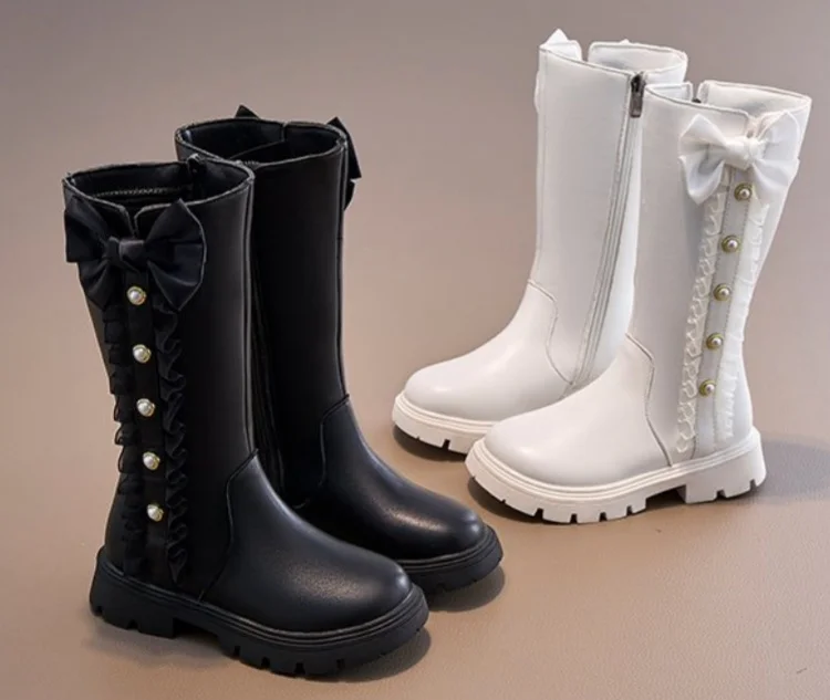 Custom Design Kids Boots Girl Long Zipper Boots Western Bowknot Beaded Girl's Chunky Heel Black White Dress Knee High Boot