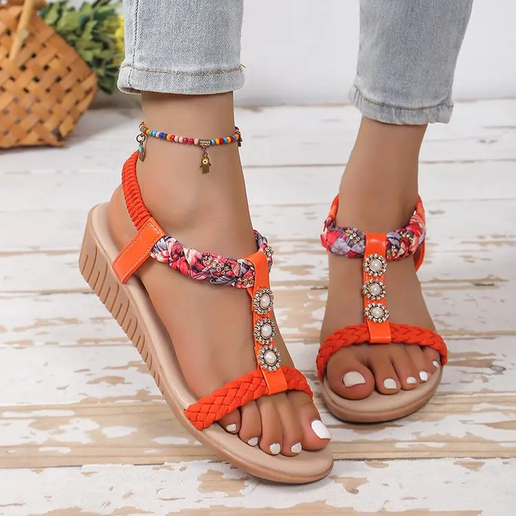 Custom Logo Women Sexy Diamond Flat Sandals Plus Size Comfortable Orange Wedge Heel Roman Summer Beach Sandals