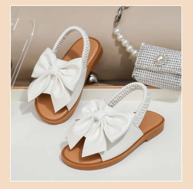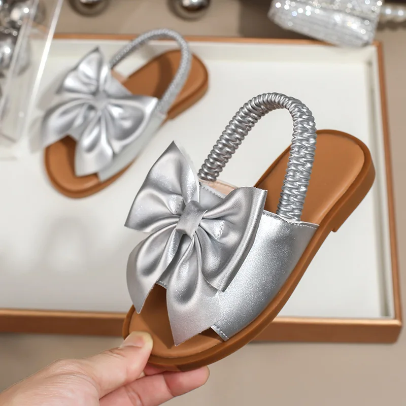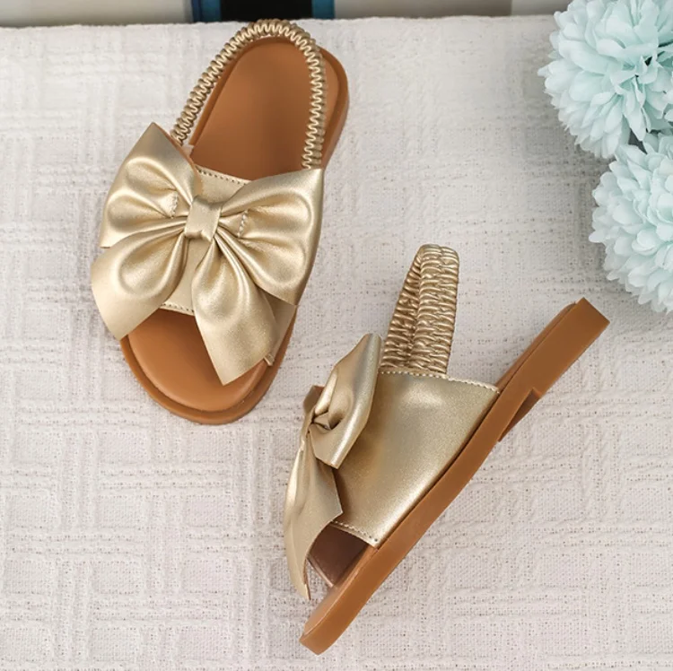 BSCI/Smeta/Sedex/Higg/GRS Factory Wholesale Custom Logo Baby Girl Gold Bowknot Sandals Elastic Webbing Princess Slipper Sandal