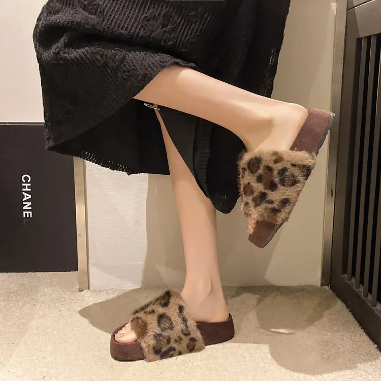 Wholesale Plush Lady 5cm Platform Leopard Designer Slides Plush Thick Sole Custom Logo Women Warm Fur Slippers