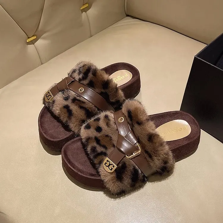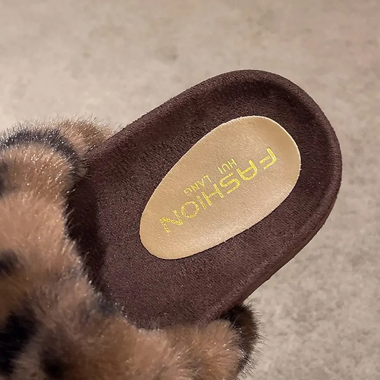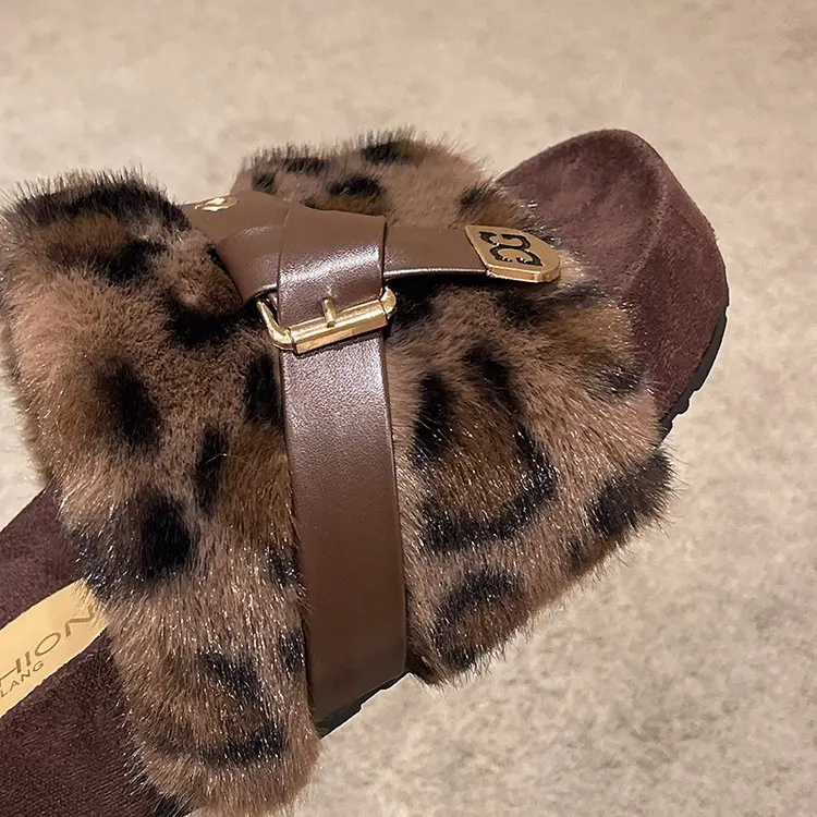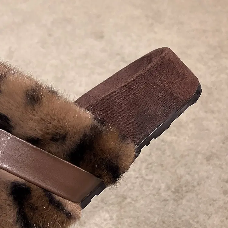 Wholesale Custom New Open Toe Fashion Fluffy Leopard Slippers Lady Girl Indoor Outdoor Fuzzy Ladies Slipper Faux Fur Slippers