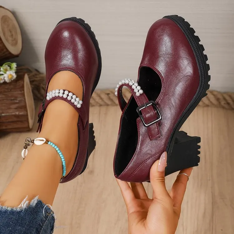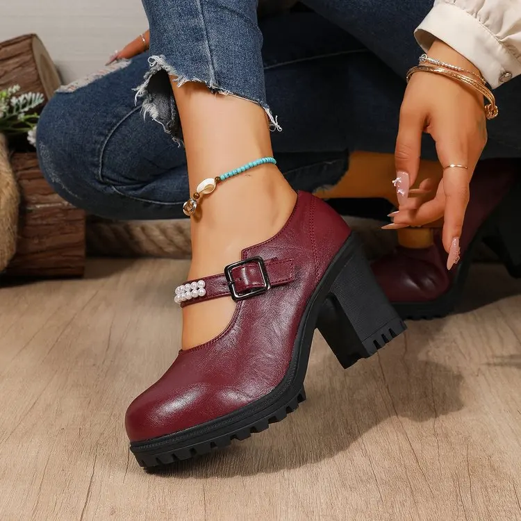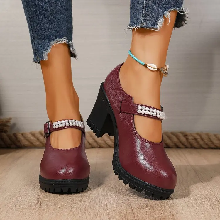 Wholesale Ladies Beaded Women's Platform Dress Shoes Fashion Women Brown Platform Pumps Mary & Jane Chunky Shoes