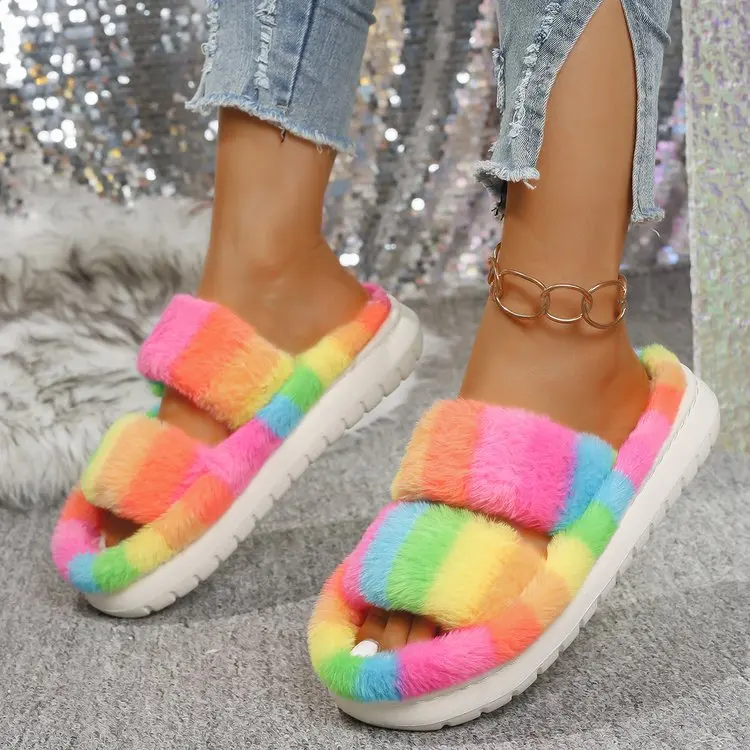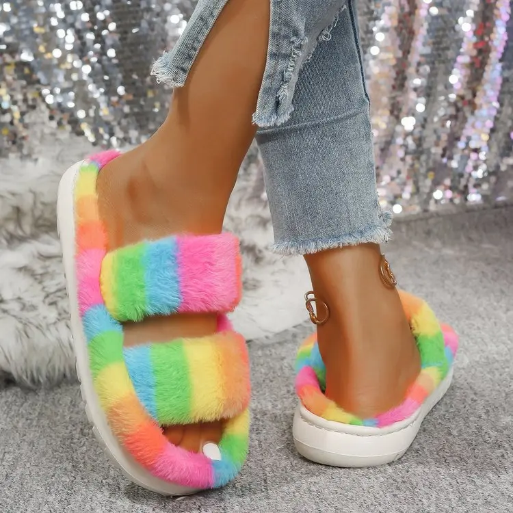 Wholesale Winter Plush Platform Fluffy Ladies Furry Indoor Outdoor Fashion Home Double Straps Rainbow Slippers for Women