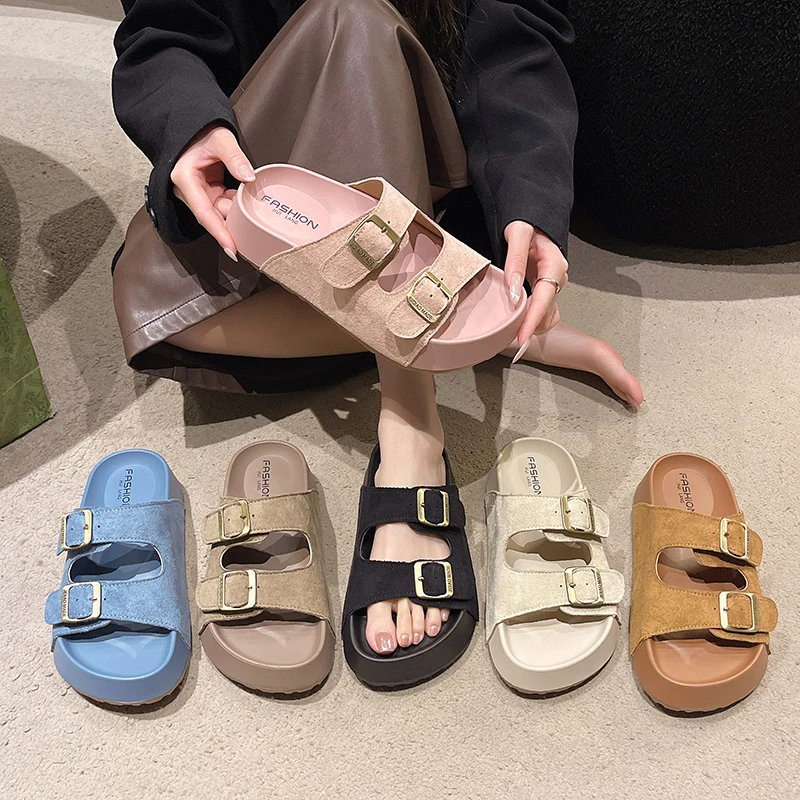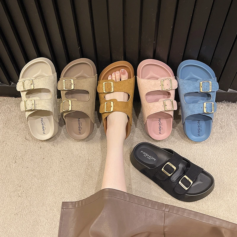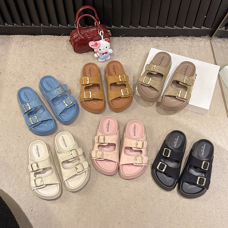 2026 Summer Women's Retro Double Buckle slippers New Casual Flat Shoes Wooden Soles